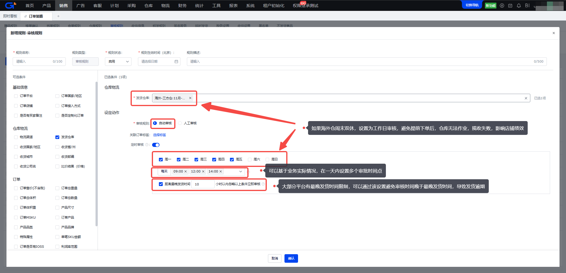如果需要在推送仓库前对订单的仓配信息的准确性、预估物流费用是否过高等信息进行二次确认,可以设置人工审核。