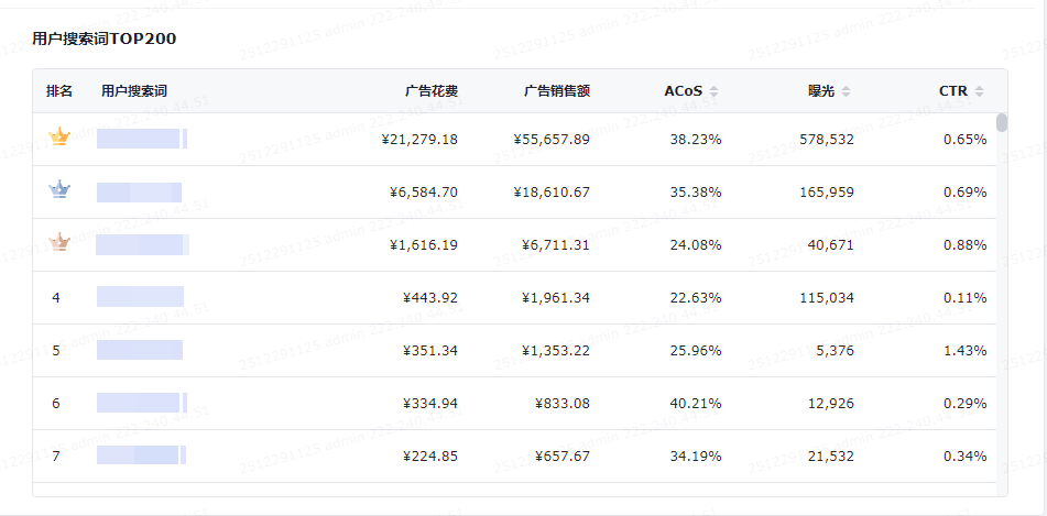 以表格形式展示 TOP200 用户搜索词的 “广告花费”“广告销售额”“ACOS”“曝光”“CTR” 等核心指标,支持列排序与搜索词下钻,助力运营人员精准分析搜索词表现。