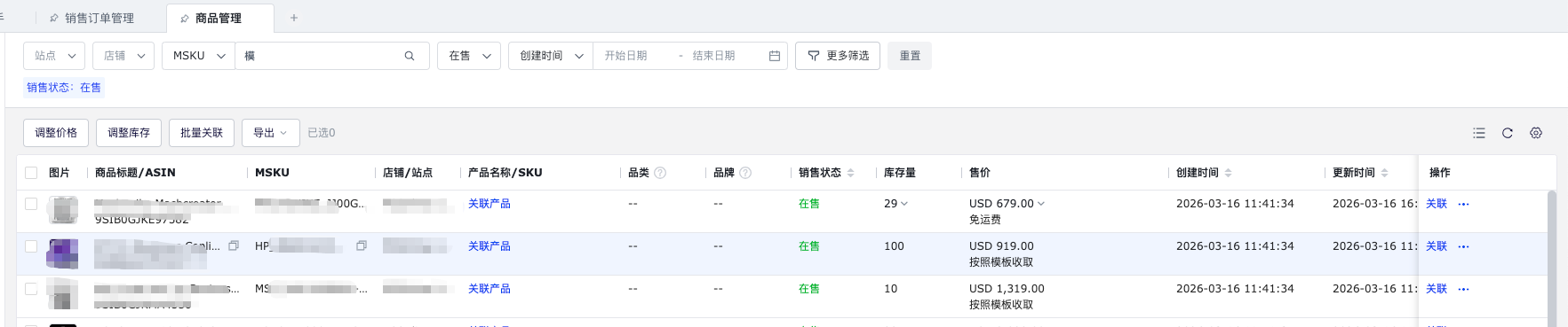 在列表中产品名称/SKU列或者操作栏都可以进行关联