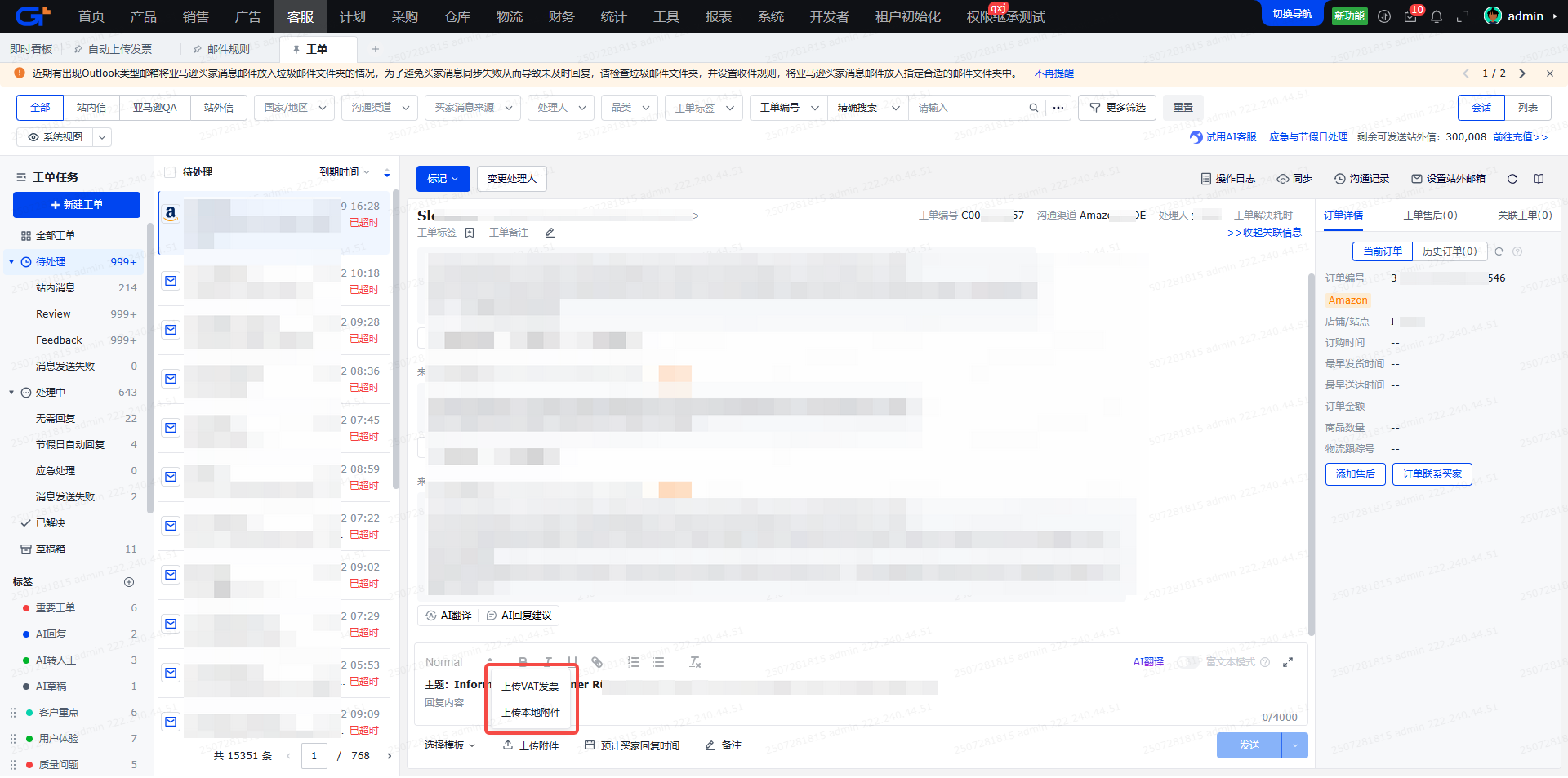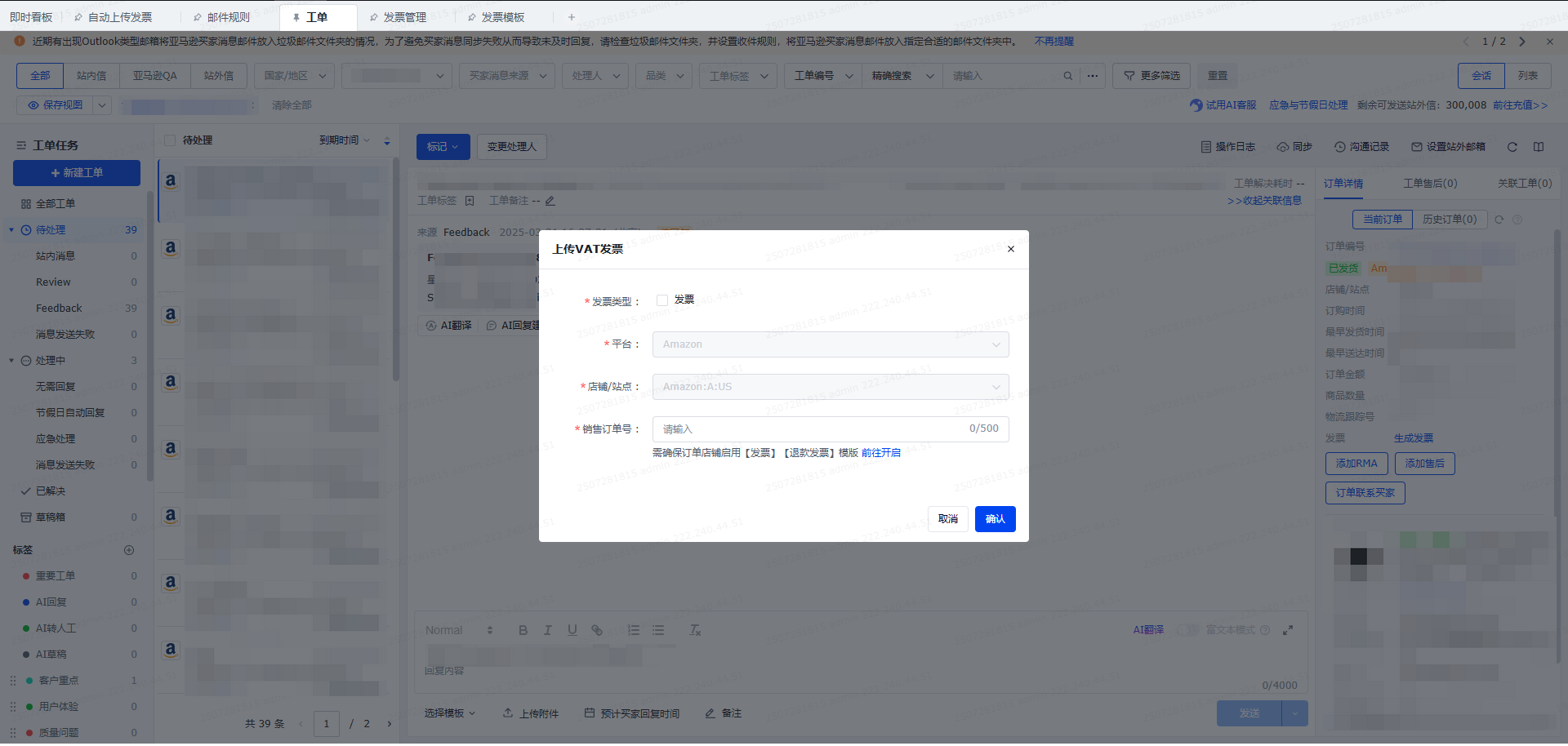 - 站内信:包含沟通渠道为平台内的工单,目前支持平台有:Amazon、Walmart、eBay、