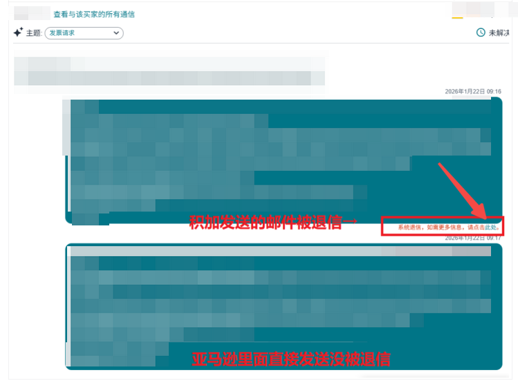Q3:同样的邮件内容,通过亚马逊后台正常发送,积加erp里面发生提示:系统退信,如需更多信息,请点击此处。