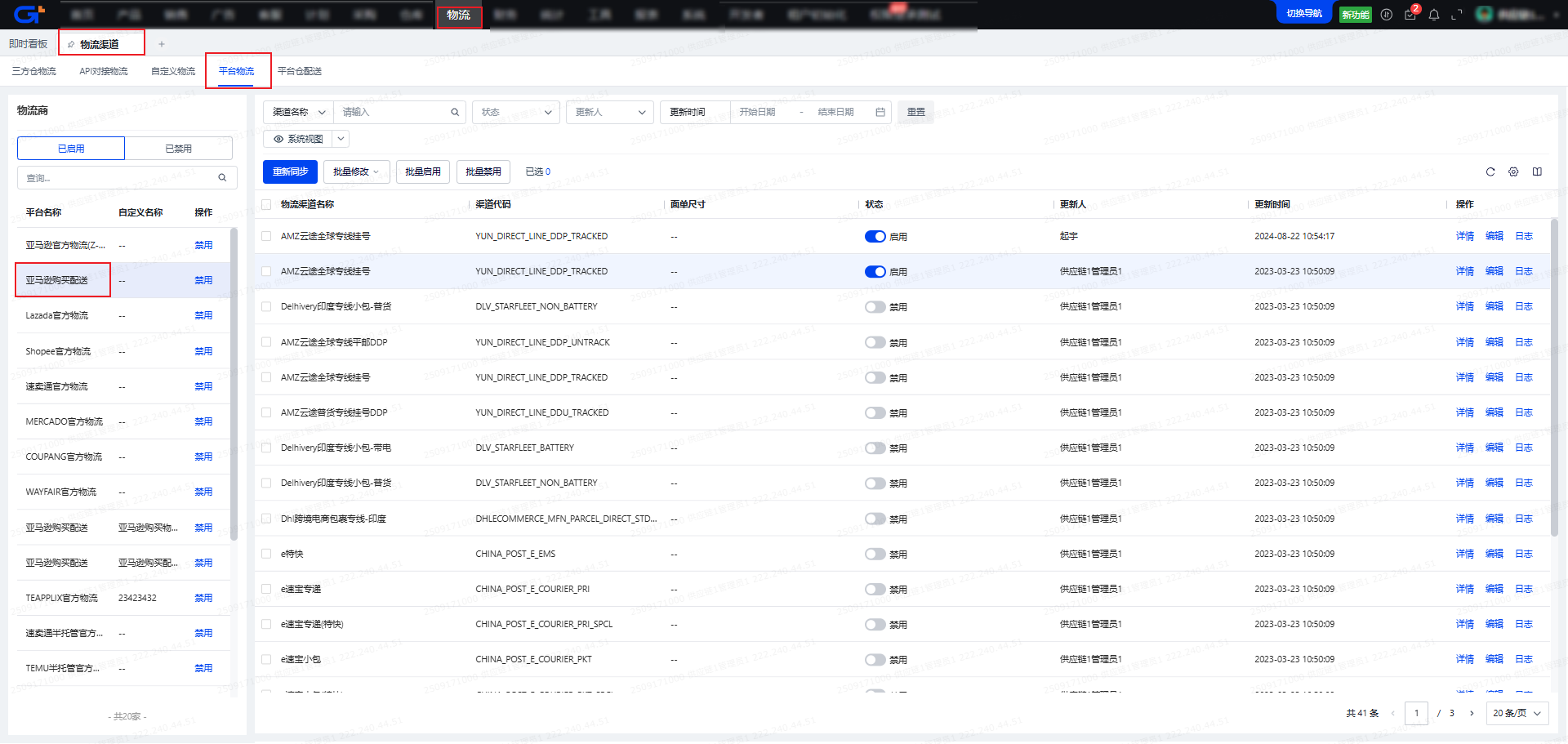 完成授权后,可以在 物流->物流渠道->平台物流 页面查看到【亚马逊购买配送】服务。
