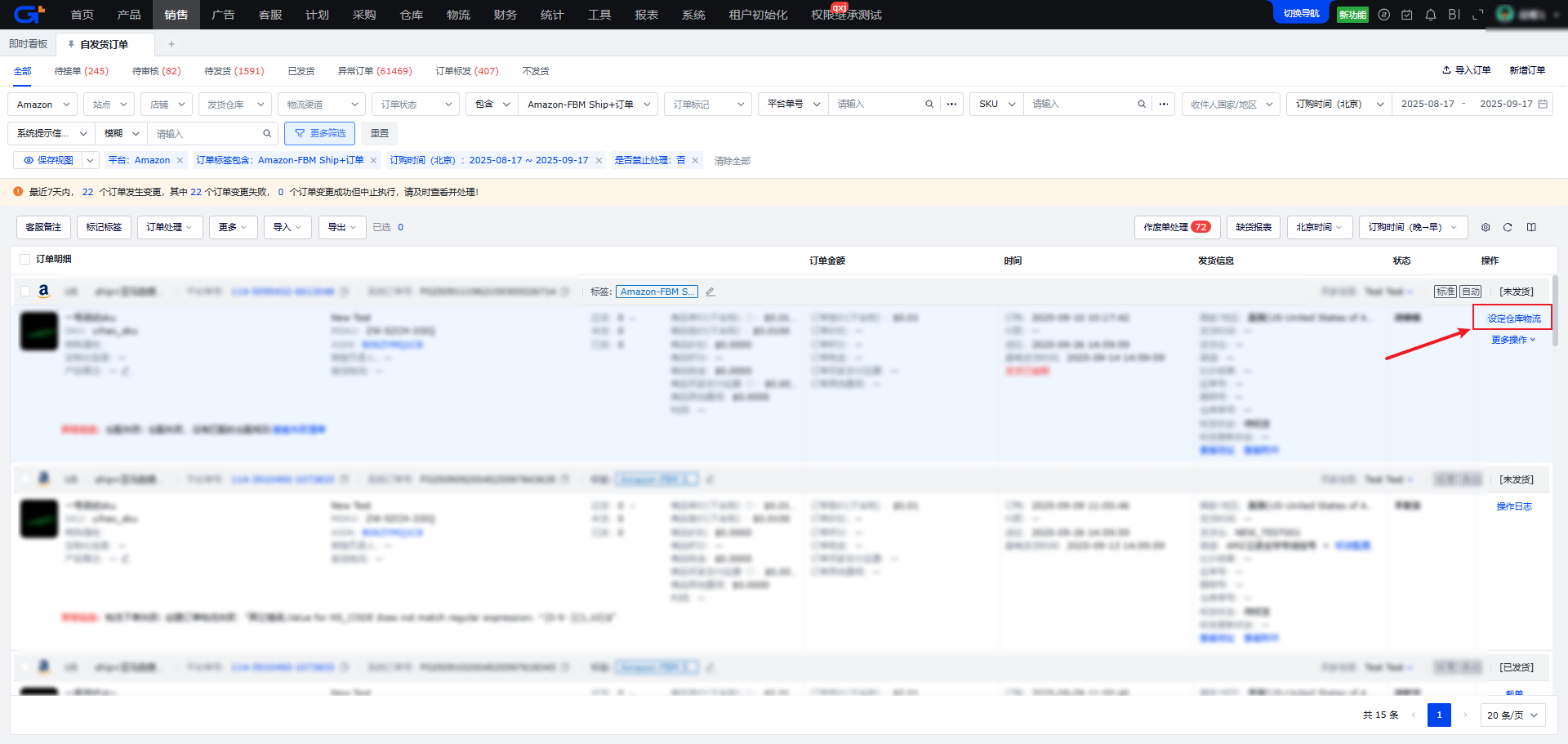点击列表后方操作栏中的【设定仓库物流】按钮,为订单分配发货仓库和物流渠道