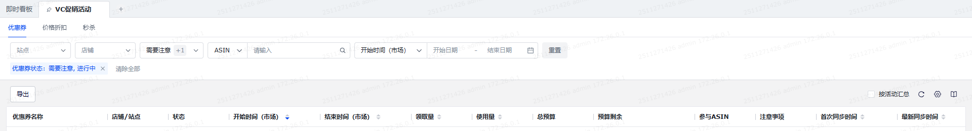优惠券支持按照:站点、店铺、优惠券状态、ASIN、优惠券名称、活动名称、开始时间(市场)、结束时间(市场)查询