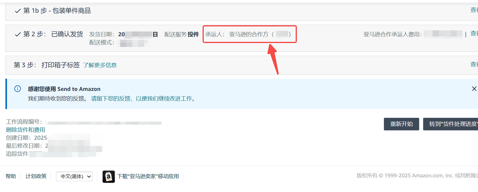 填写完后点击【确认并发货】,系统会以您确认的“分仓方案”、配送方式”、“承运商”和“送达时段”提交给亚马逊,提交成功后,系统会自动进入到第四步:打印箱子标签