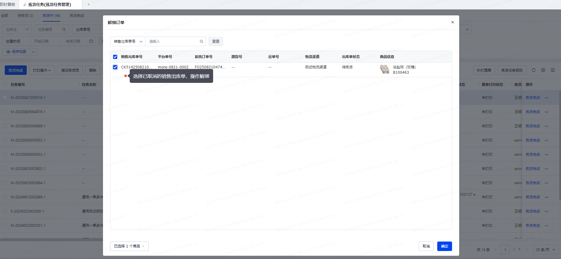 “待拣货”“拣货中”“拣货完成”状态任务支持解绑已取消订单,解绑后该订单将从拣货任务中剔除。