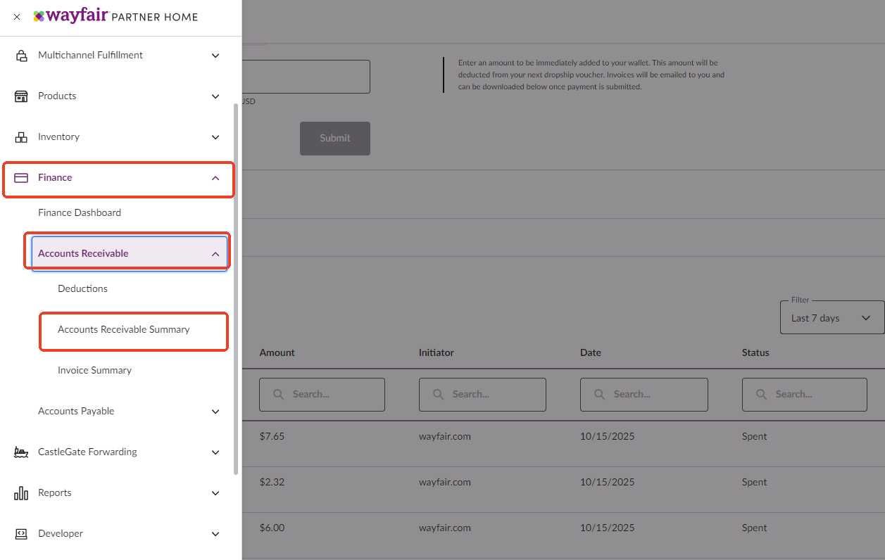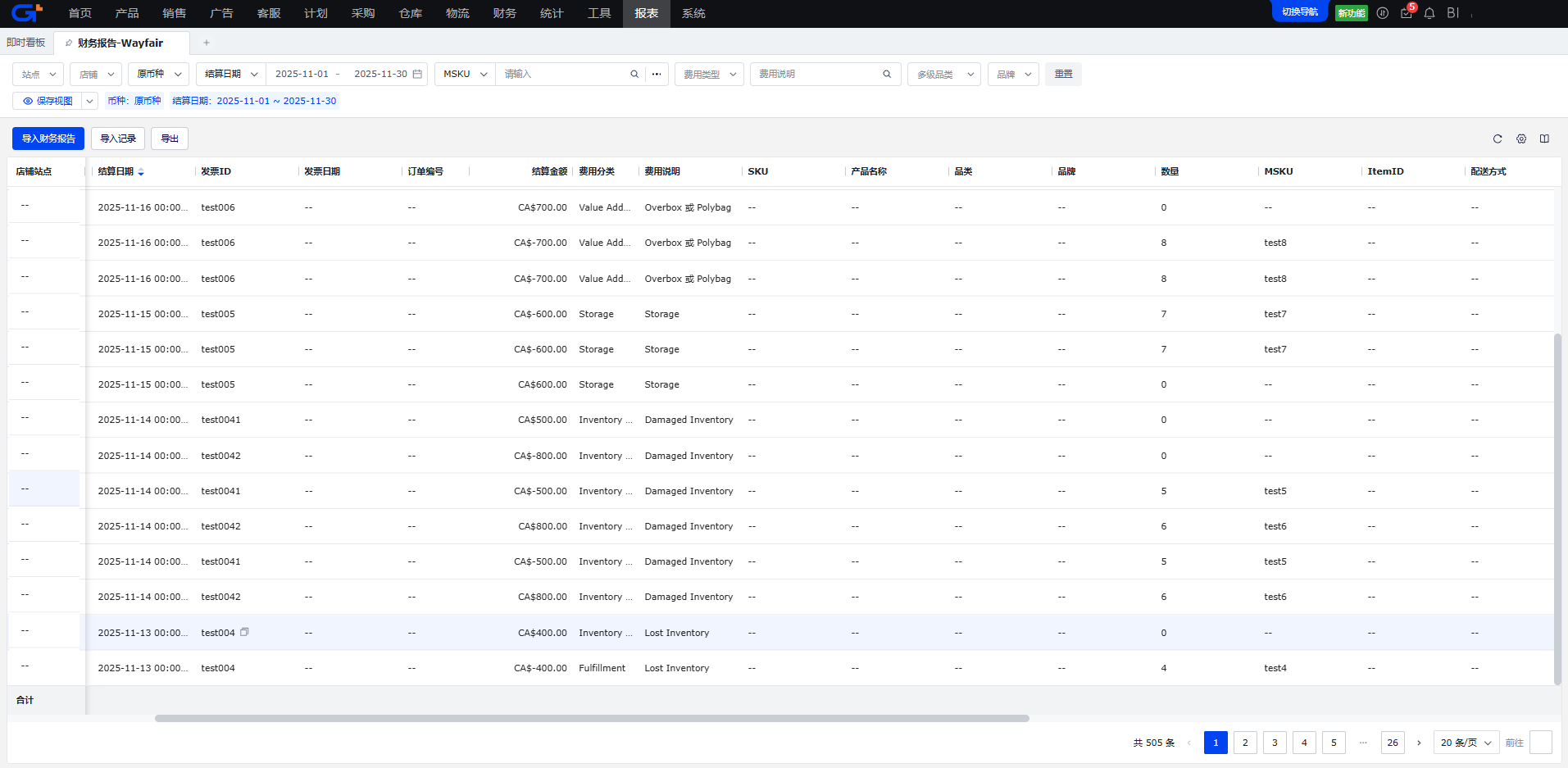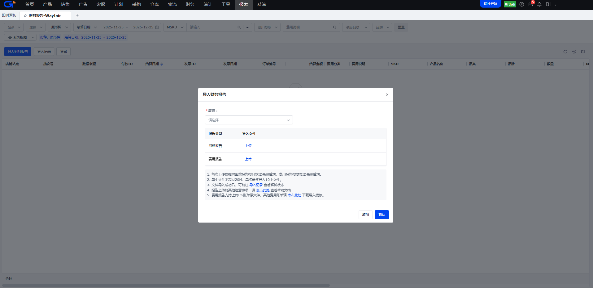此模块所有数据都来自Wayfair后台,平台暂未开放财务报告API接口,请在店铺后台的[Finance]模块下分别导出报告后上传至ERP。