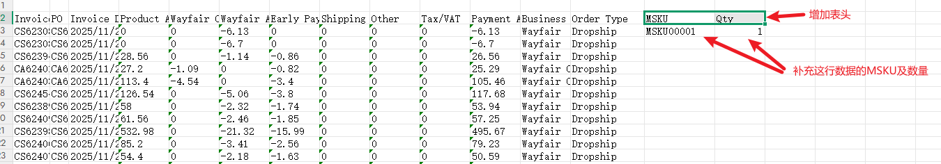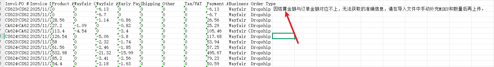 Q1:文件导入失败,错误文件中提示[因结算金额与订单金额对应不上,无法获取准确的信息,请在导入文件中手动补充MSKU和数量后再上传] ?