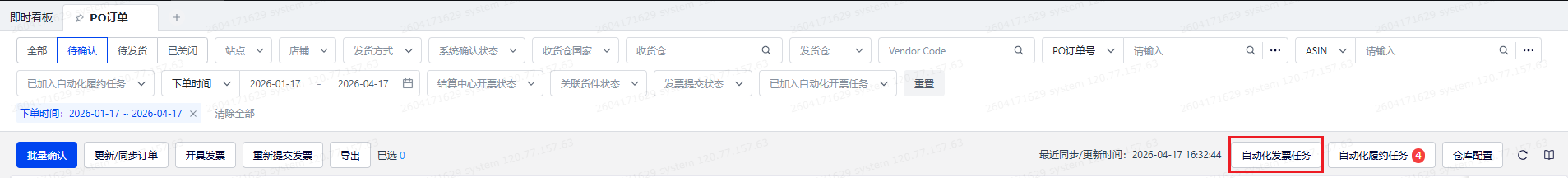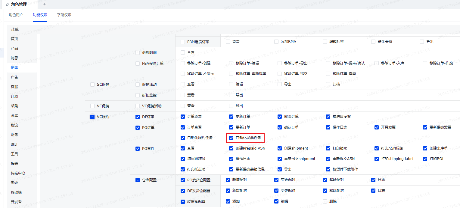 入口:系统-权限管理-角色管理(销售-亚马逊VC-VC PO订单):勾选“自动化发票任务”