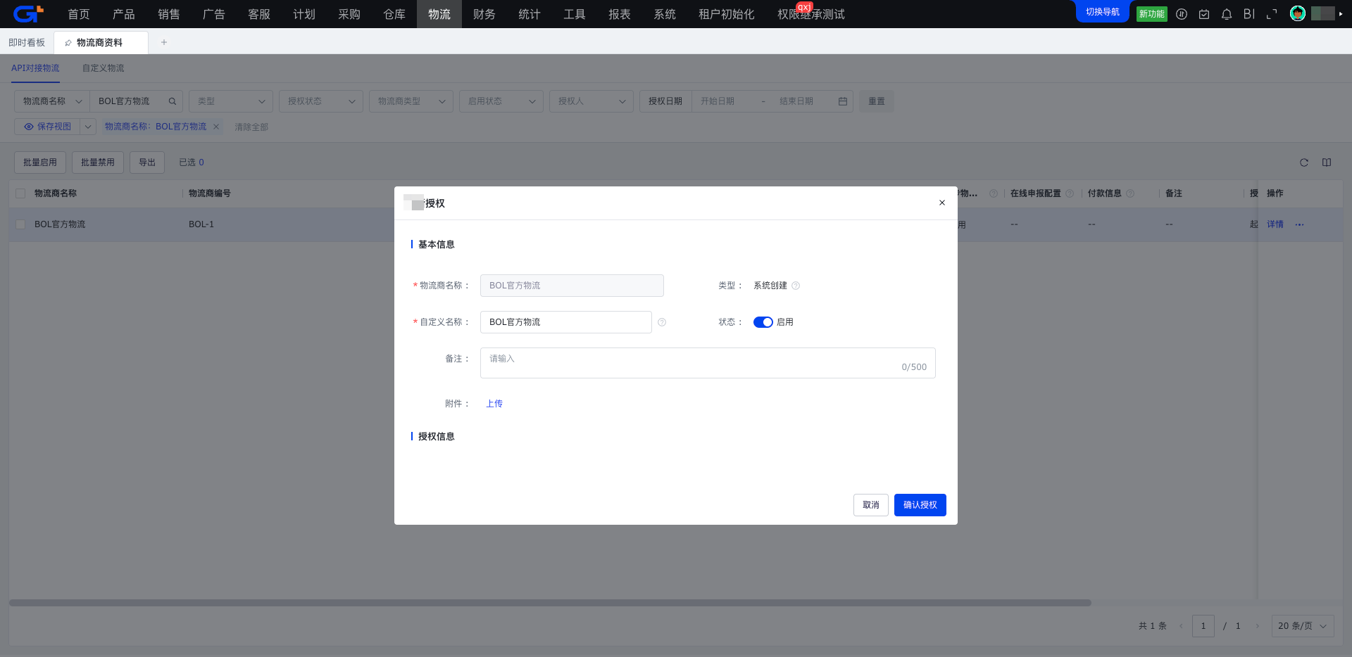 1. 授权入口:物流-基础配置-物流商资料/API对接物流