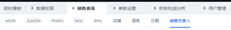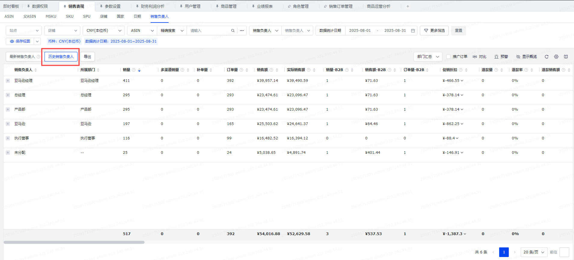 销售负责人维度:维度为销售负责人,支持查看最新销售负责人和历史销售负责人维度的统计数据,父列表有部门/店铺/国家汇总,子列表均为人员,即子列表一行的数据就是一位销售负责人的数据汇总