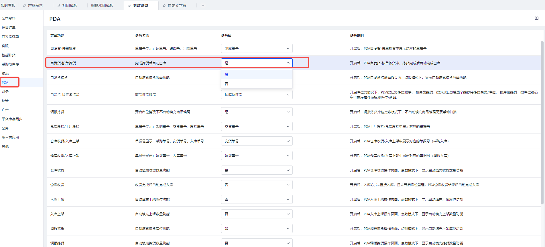 如果拣货时需要自动完成出库,请【系统-参数设置-PDA-自发货-按单拣货】开启参数设置开关。