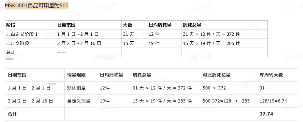 ①、库周转=(良品可用量减去每个阶段消耗总量)/ 阶段性日均销量