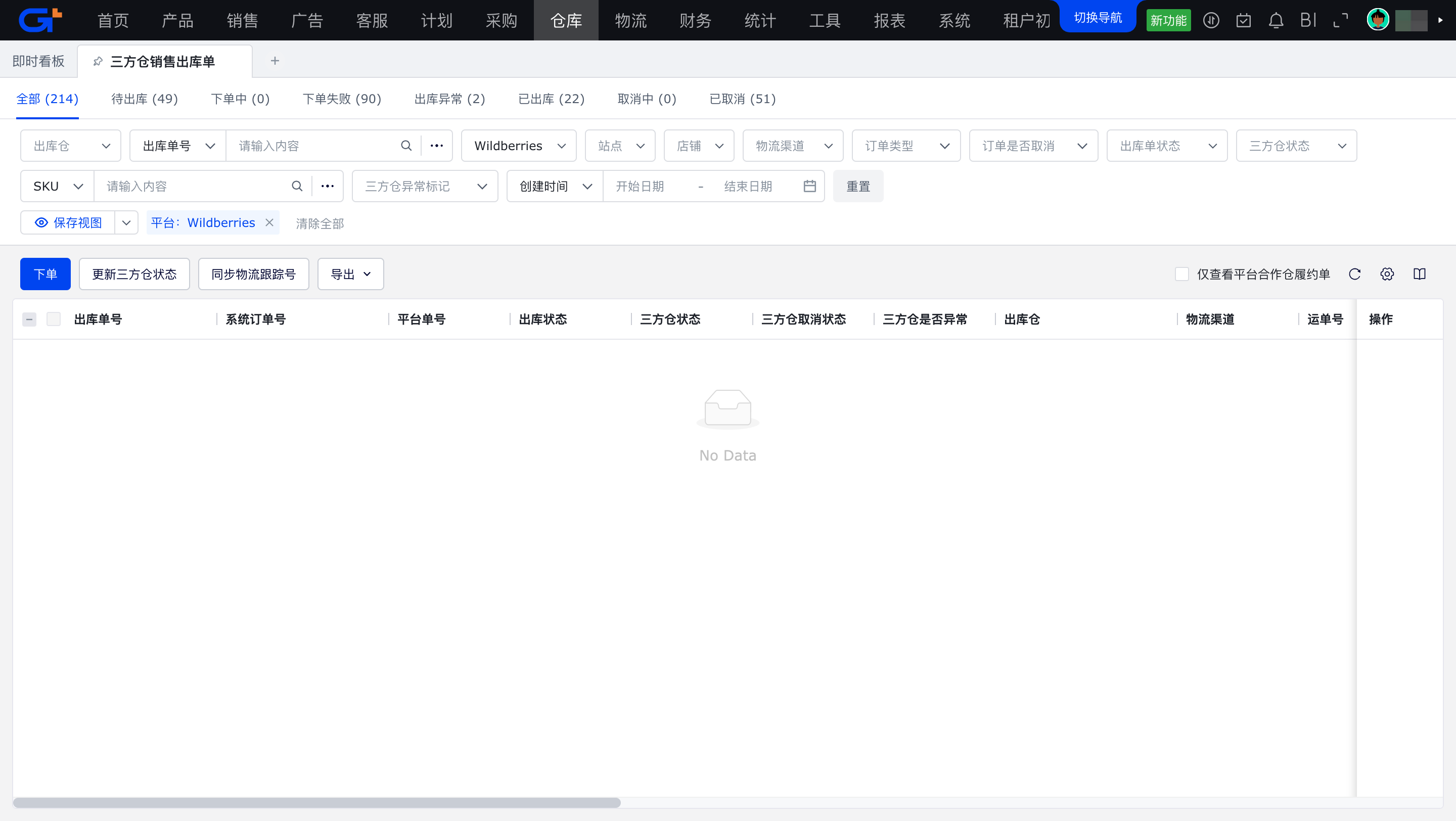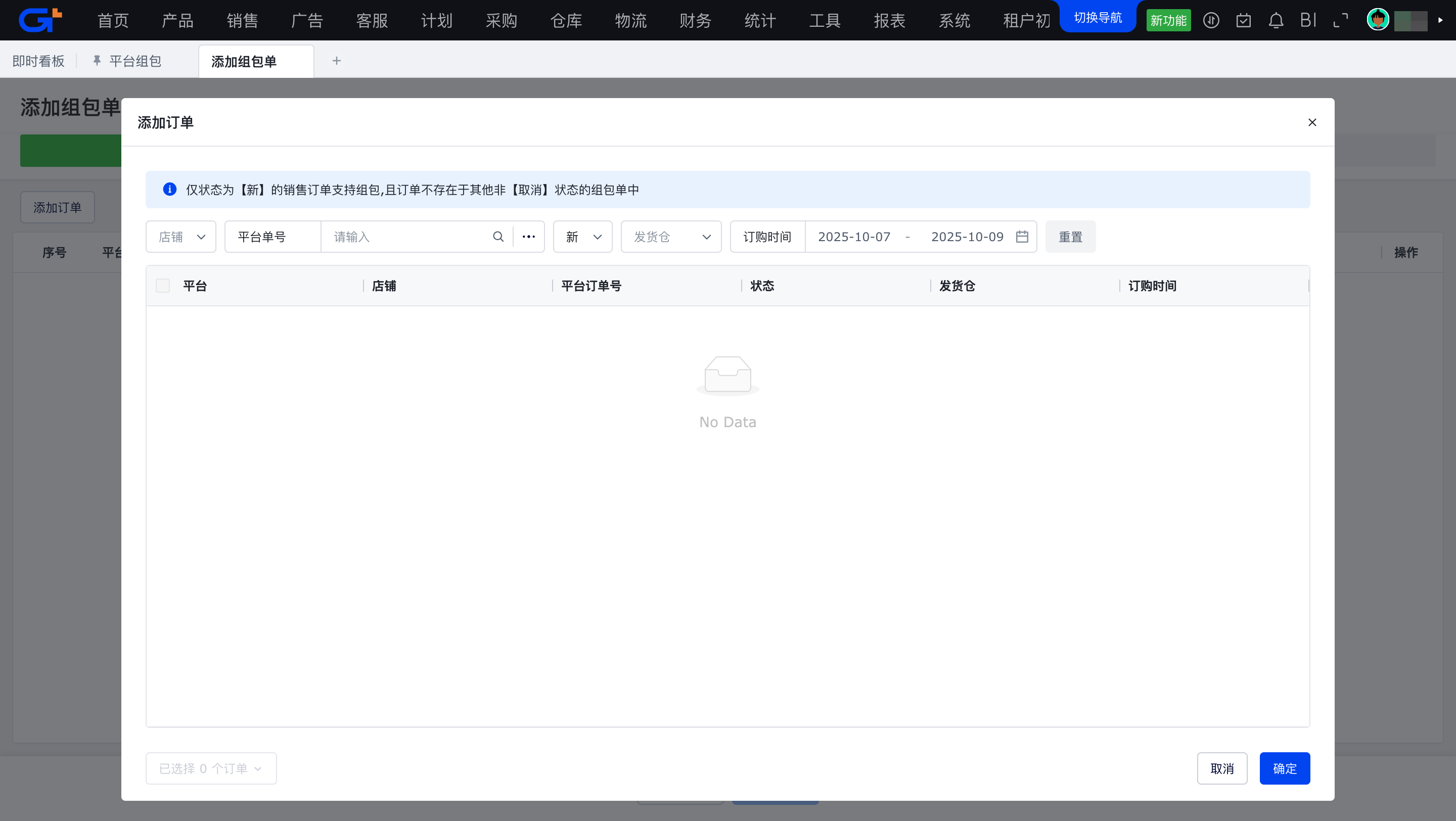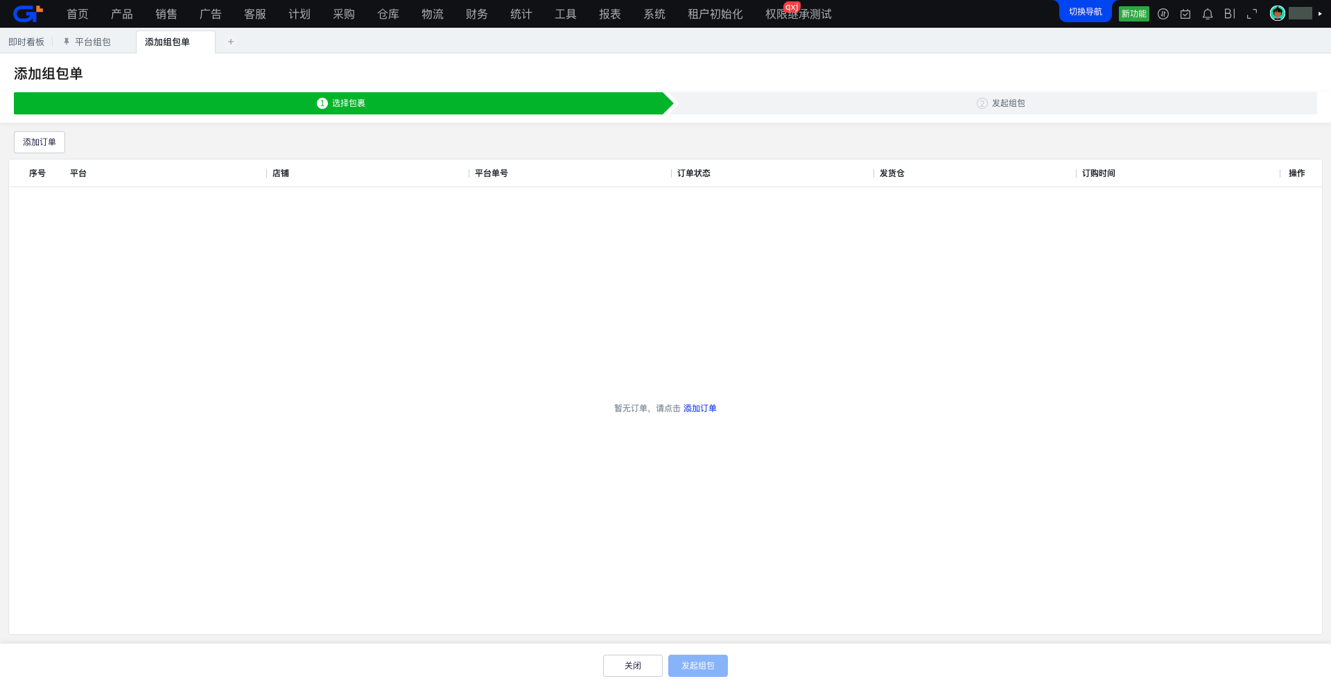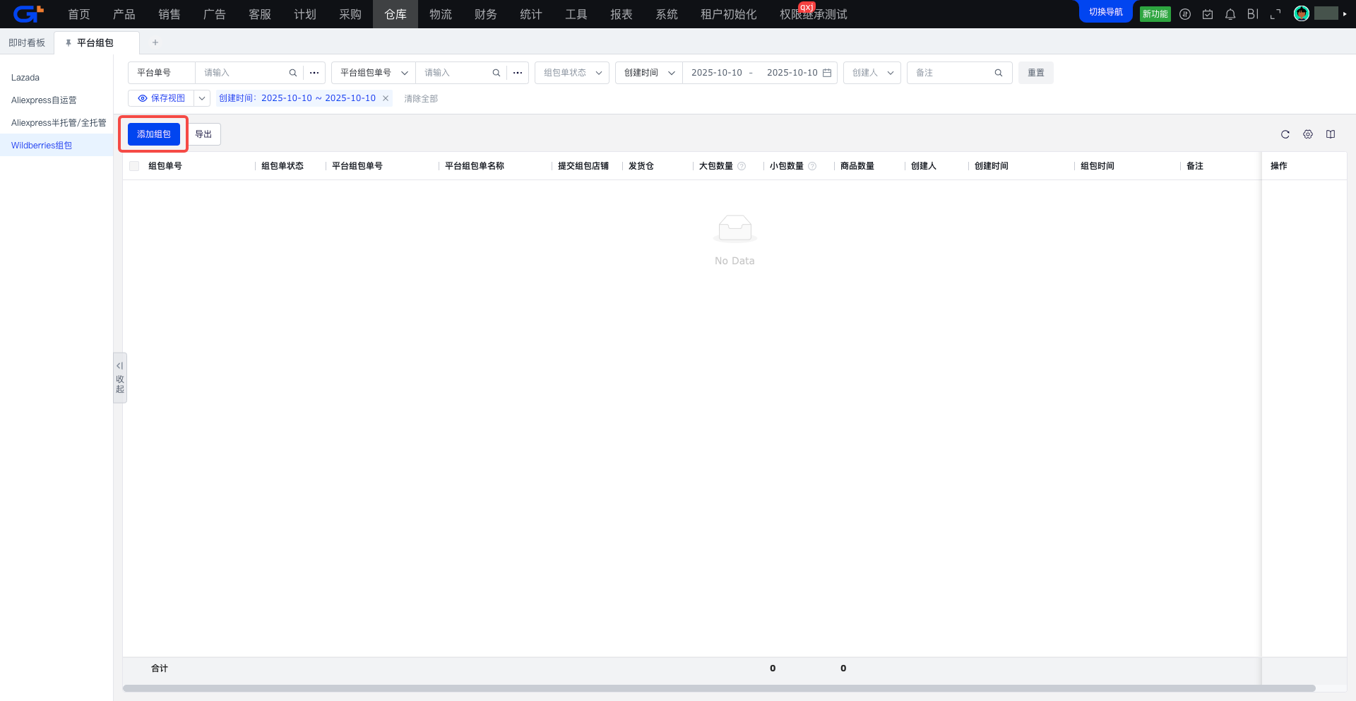 受【仓库/出库管理/平台组包】权限控制,当前只对功能做权限控制,不对平台做数据权限控制