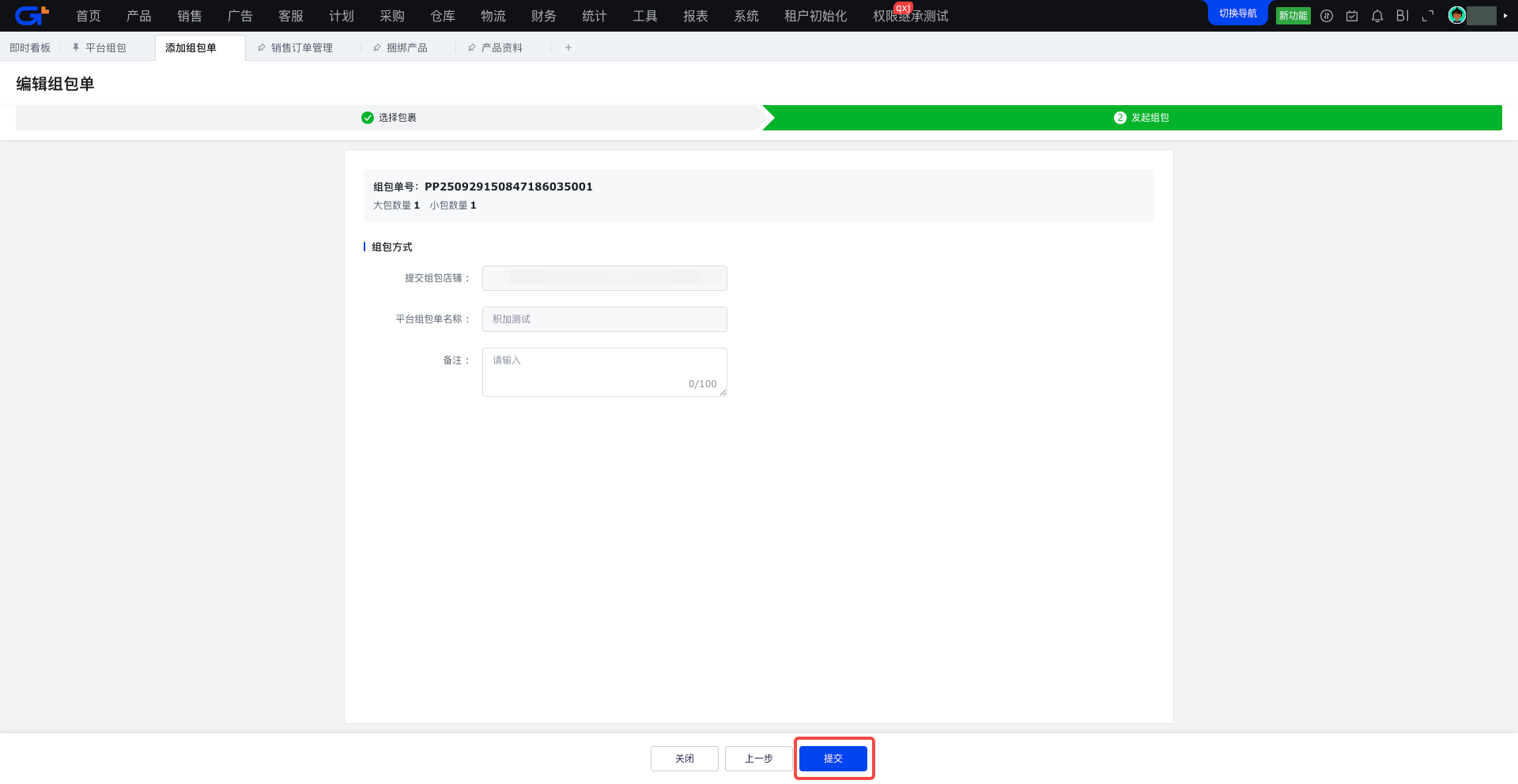 填写完相关信息后,点击【提交】按钮,完成向平台提交组包