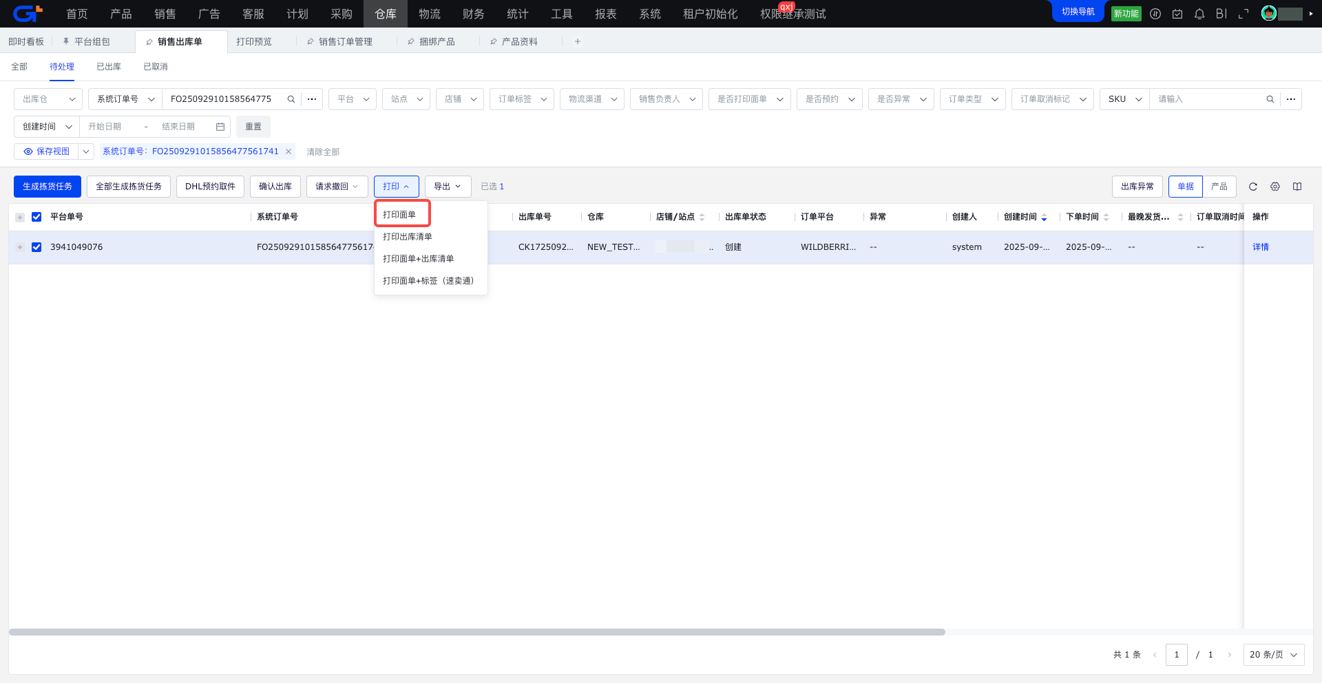 6.组包成功后,若发货仓为三方仓,则订单流转到三方仓销售出库单,面单会随着订单一起推送给海外仓
