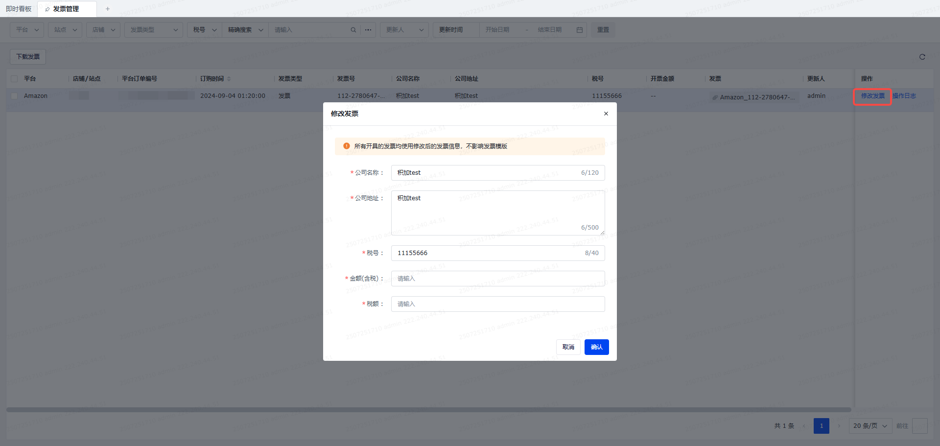Amazon仅支持修改个别字段:公司名称、公司地址、税号、总金额(含税)、税额,其余字段暂不支持修改