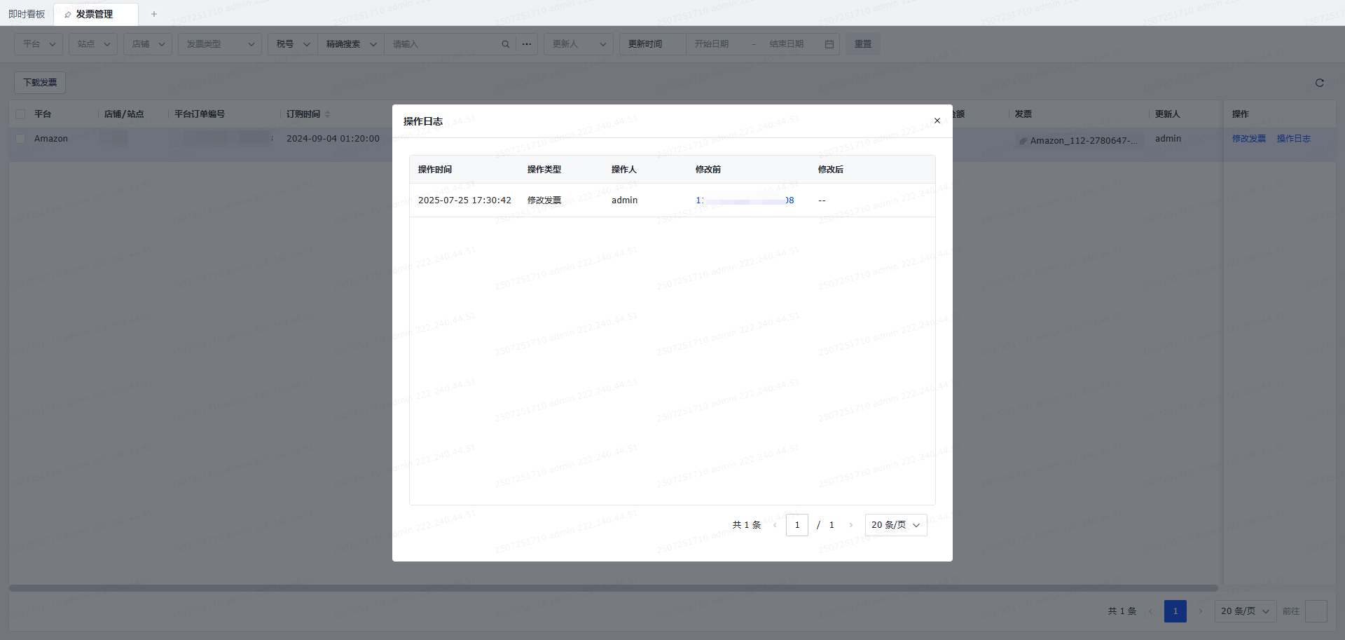 当前仅记录修改发票的操作日志,记录信息包括:操作时间、操作人、类型(修改VAT)、修改前发票附件(点击可下载)、修改后发票附件(点击可下载)