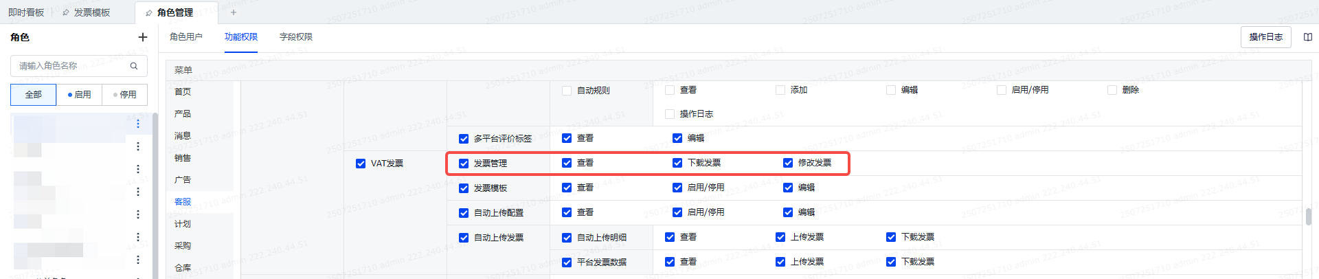 发票管理页面需要在【系统-角色管理-功能权限】下设置【客服-通用-VAT发票-发票管理】的相关权限。包含:查看、下载发票、修改发票
