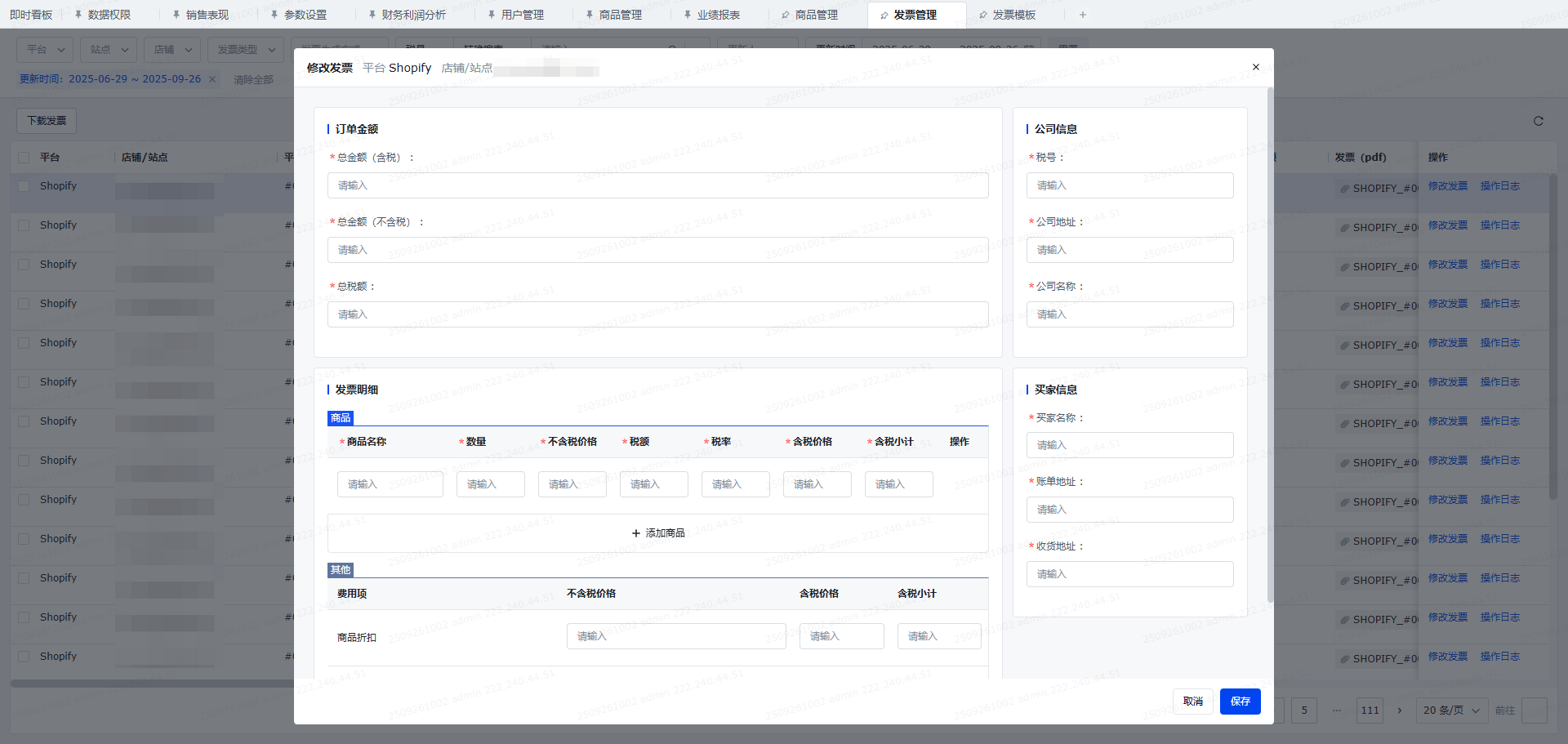 展示ERP生成的发票明细(包含:发票模版生成的全部平台的发票、自动上传配置中除亚马逊VCS lite生成的发票)。可以在该页面查询订单发票、下载发票、修改单张发票。