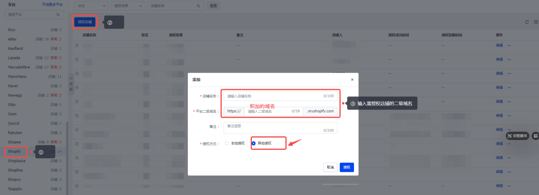 Step 1:进入多平台店铺,选择shopify平台,添加【店铺授权】,选择【异地授权】。点击【授权】后,复制链接。