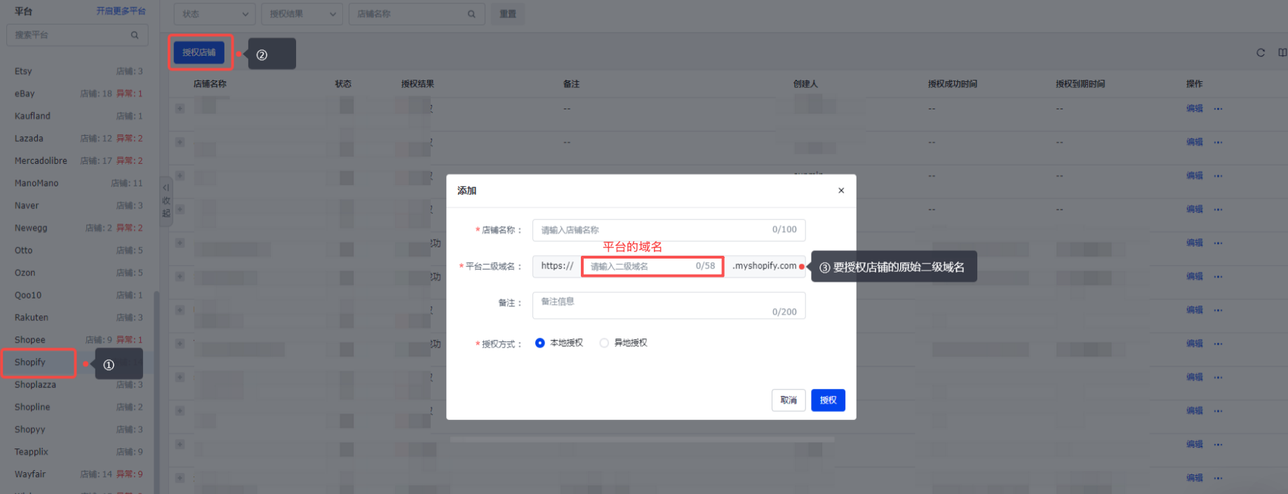 Step 1:进入多平台店铺,选择shopify平台,添加【店铺授权】,选择【本地授权】