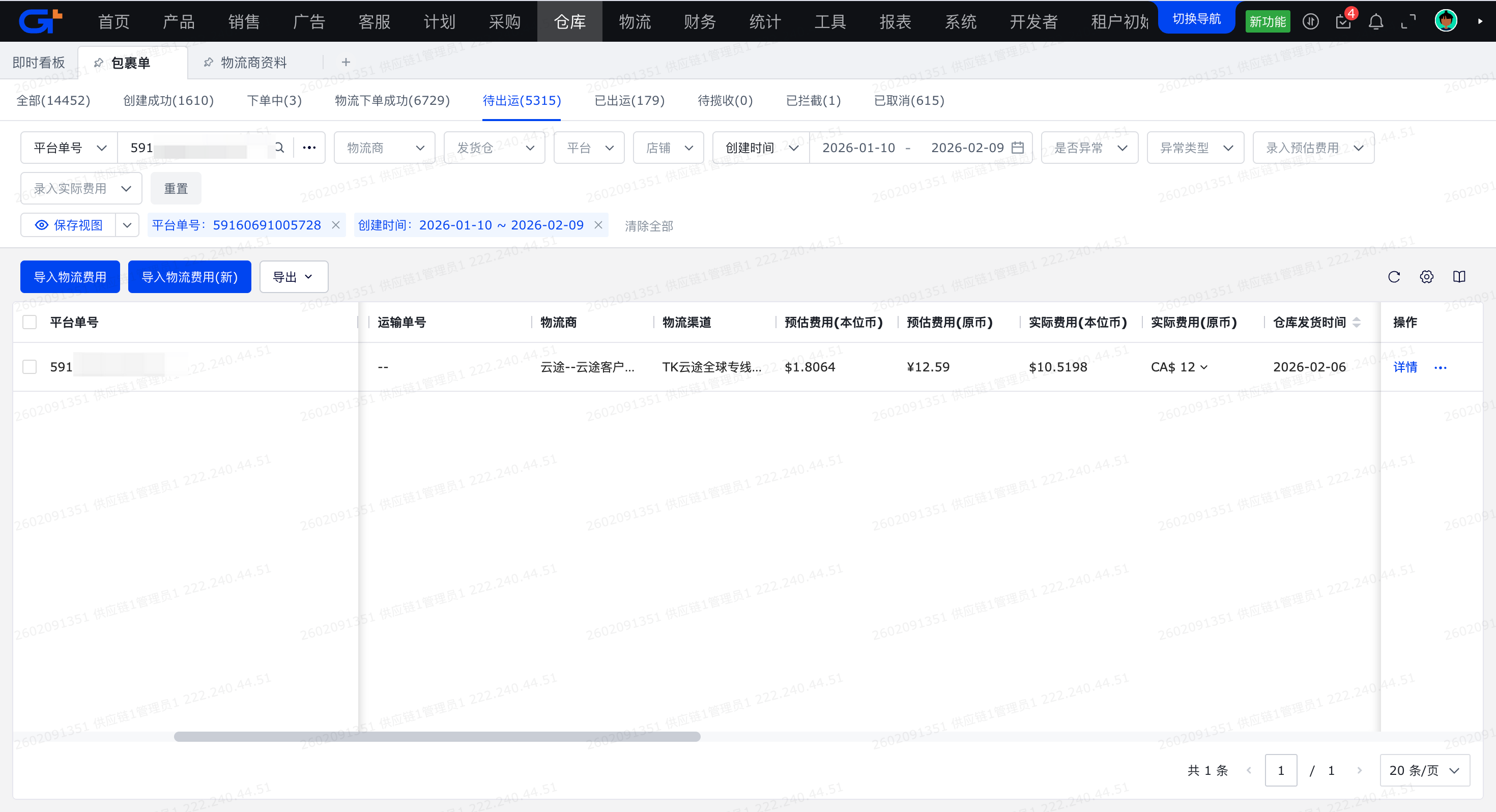 - 物流商: 指费用的产生方,显示“物流商名称--自定义名称”,若使用自传面单模式,将会显示购买面单时使用的物流商+三方仓的操作费(前提是均对接了物流商&三方仓的费用接口)