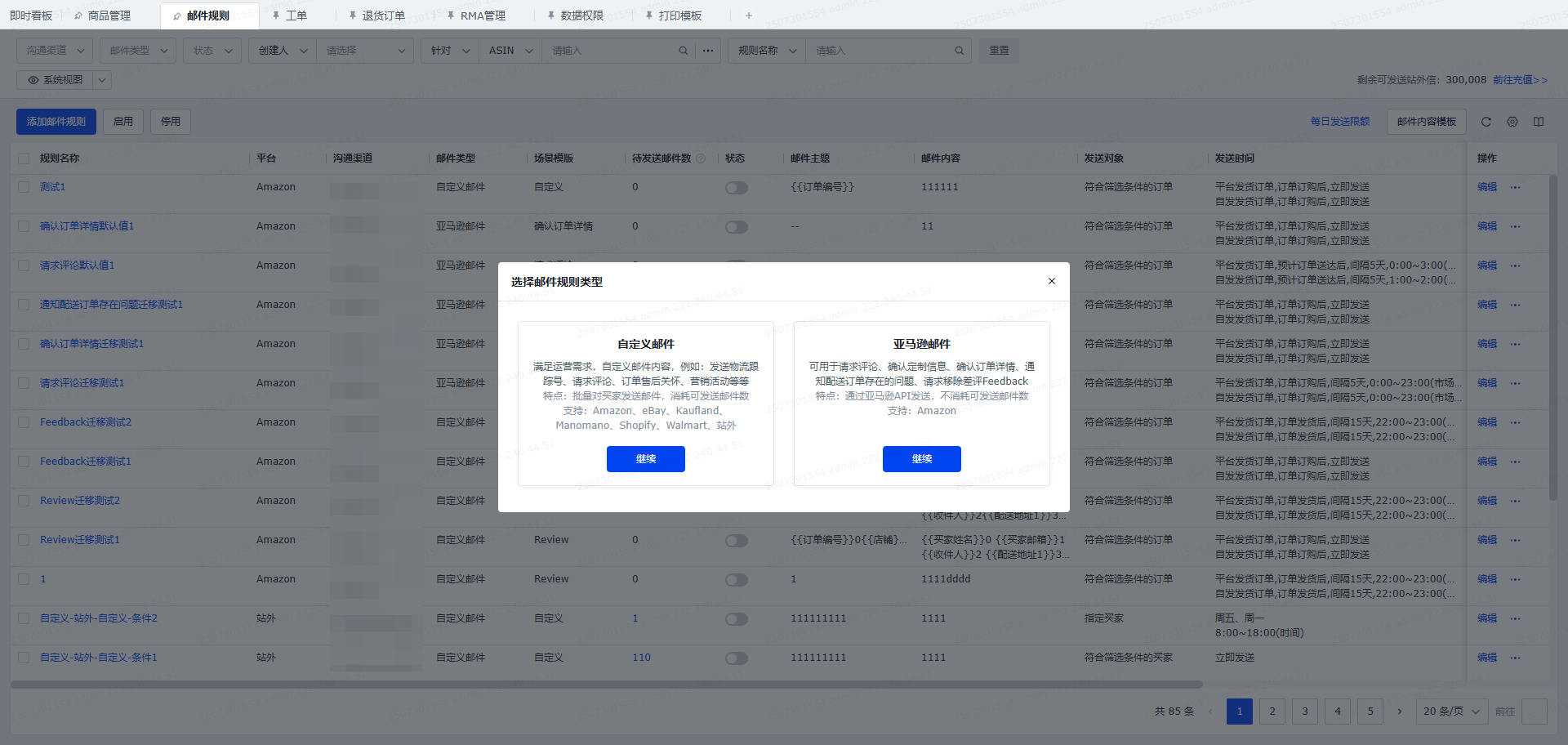 客户可自行设置一定规则,用于筛选出需要发送邮件的订单/买家,然后发送特定模版的邮件/消息。