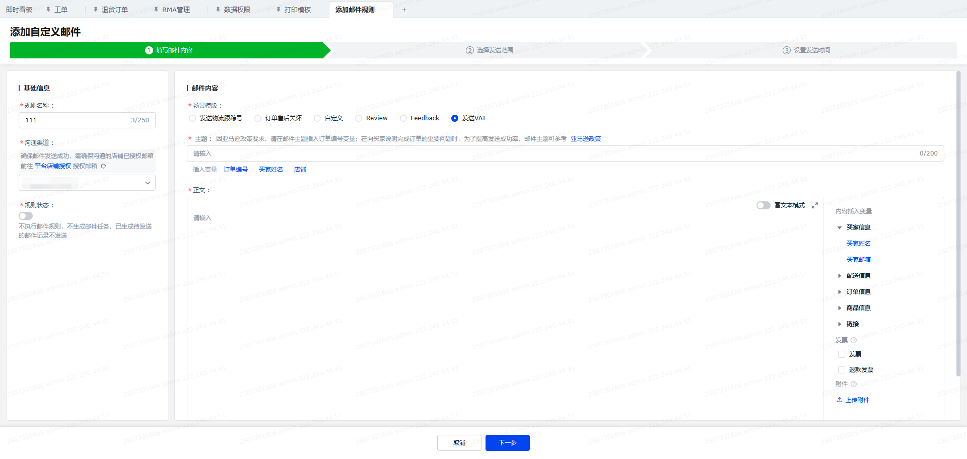 (4)支持场景:发送物流跟踪号、请求评论、订单售后关怀、营销活动(注意邮件内容、避免触碰平台红线)、自定义、feedback、review、发送VAT