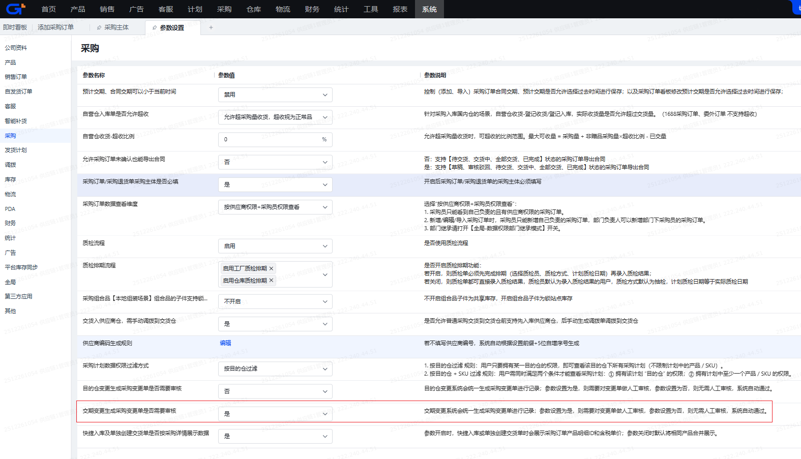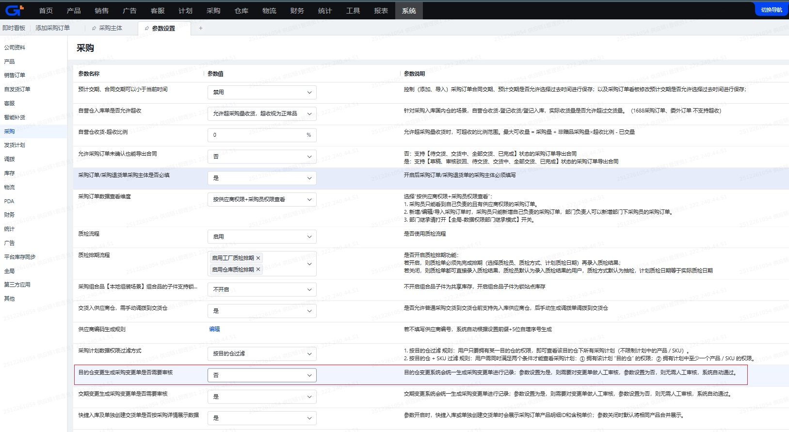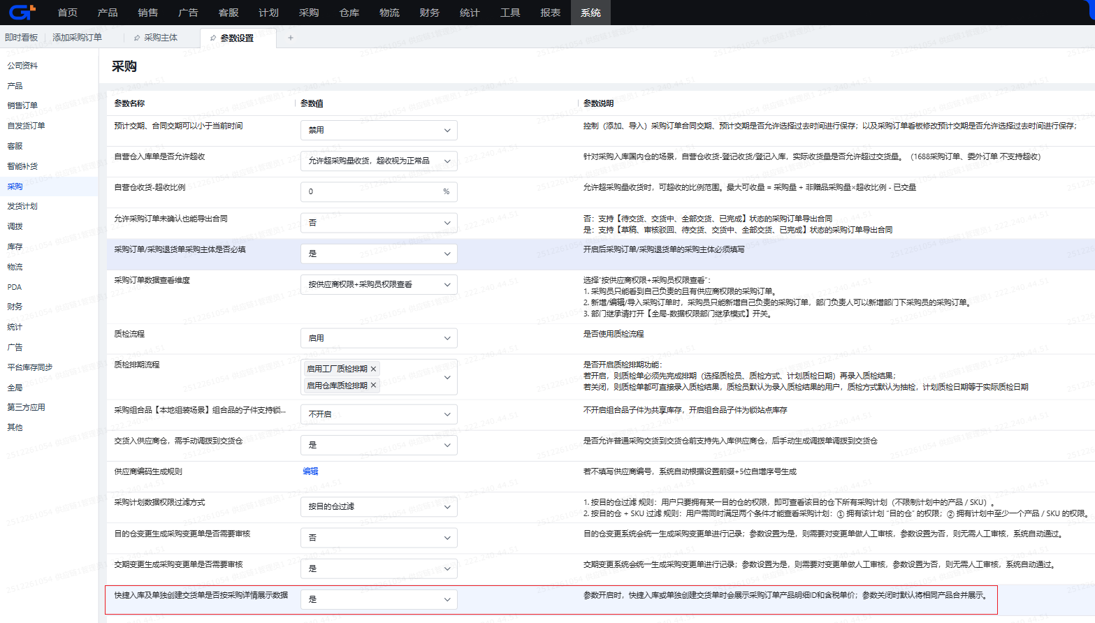 注:如果希望快捷入库一个采购订单内同一个产品按不同的价格展示,并分开快捷入库,可开启以下系统参数