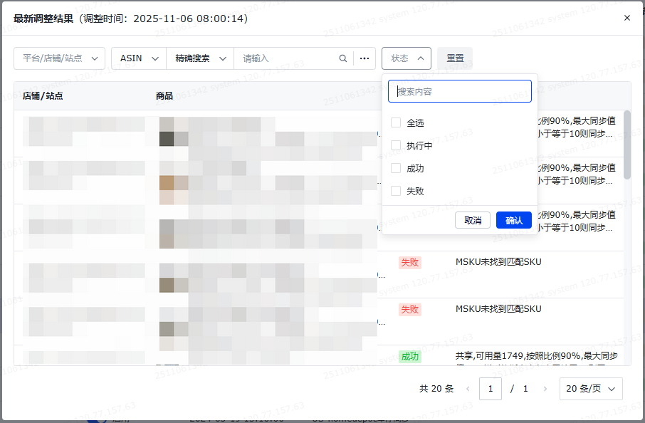 点击规则执行结果的标签可查看商品执行明细,包括执行状态、执行结果
