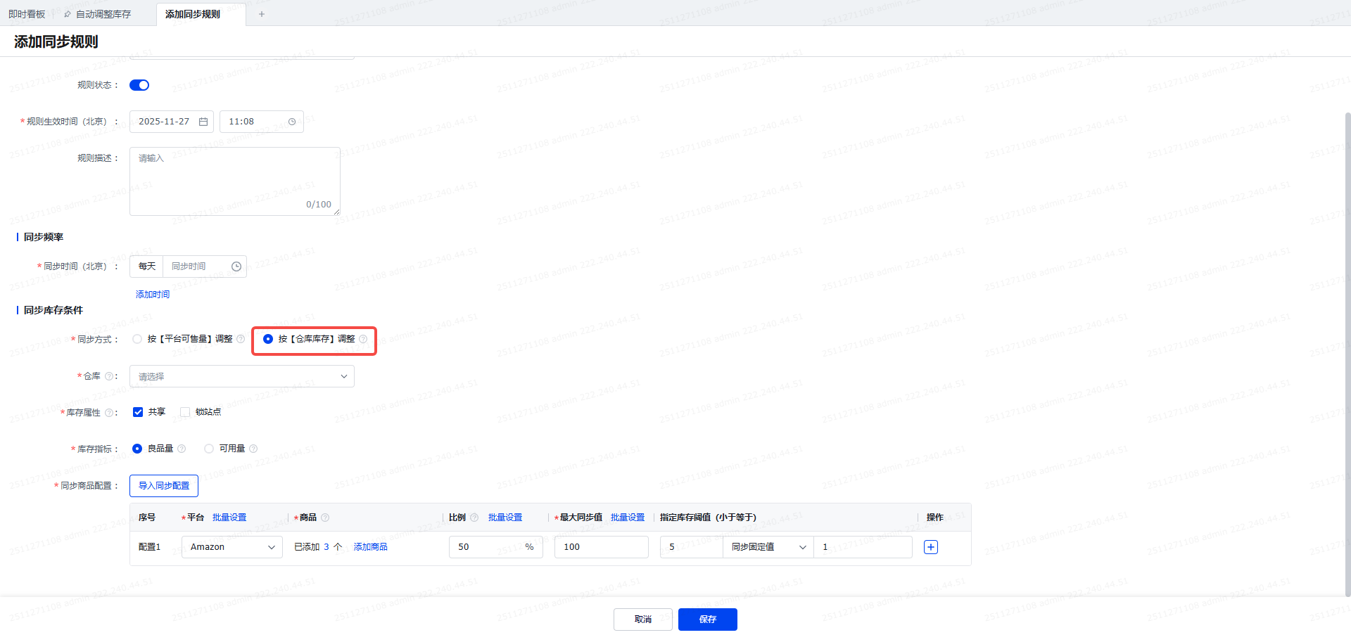 设定方式4:仓库{三方仓},库存属性只有共享,库存指标{良品可用量},最大同步值{设个不可能上限X},指定库存阈值(小于等于){设个不可能下限X}则{不同步}