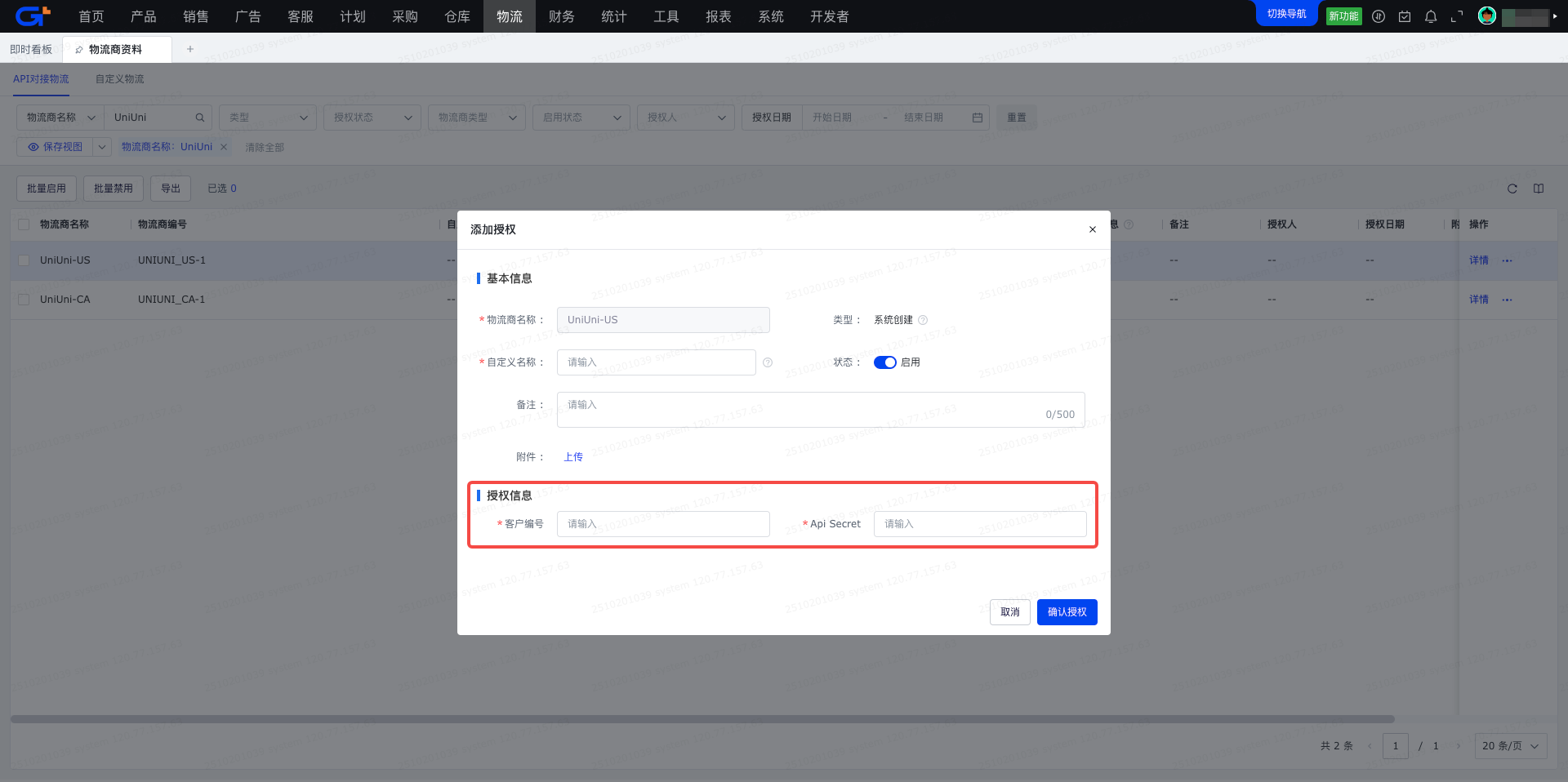 针对国家的不同(美国&加拿大),系统将UniUni物流分为两个物流商:UniUni-US、UniUni-CA,请根据自身情况选择对应的物流商进行授权和使用