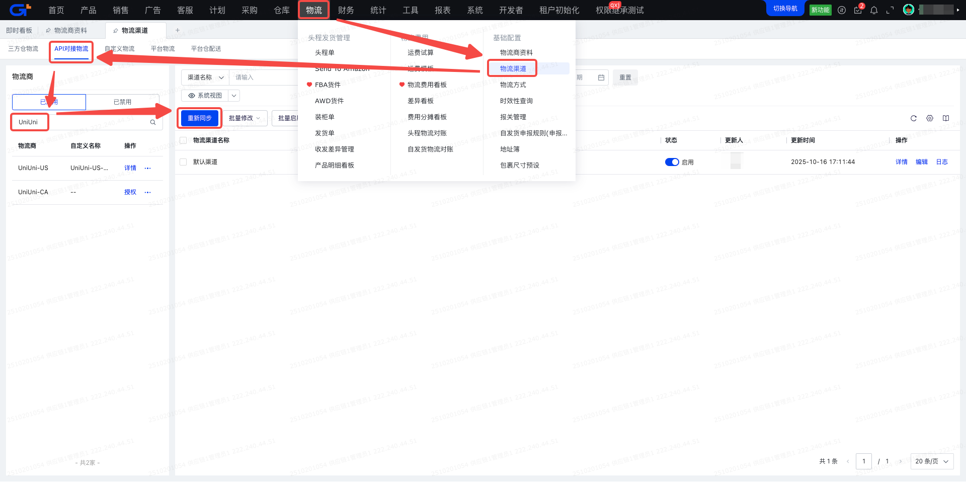 点击【重新同步】,从显示的物流渠道中找到需要使用的物流渠道并进行“启用”
