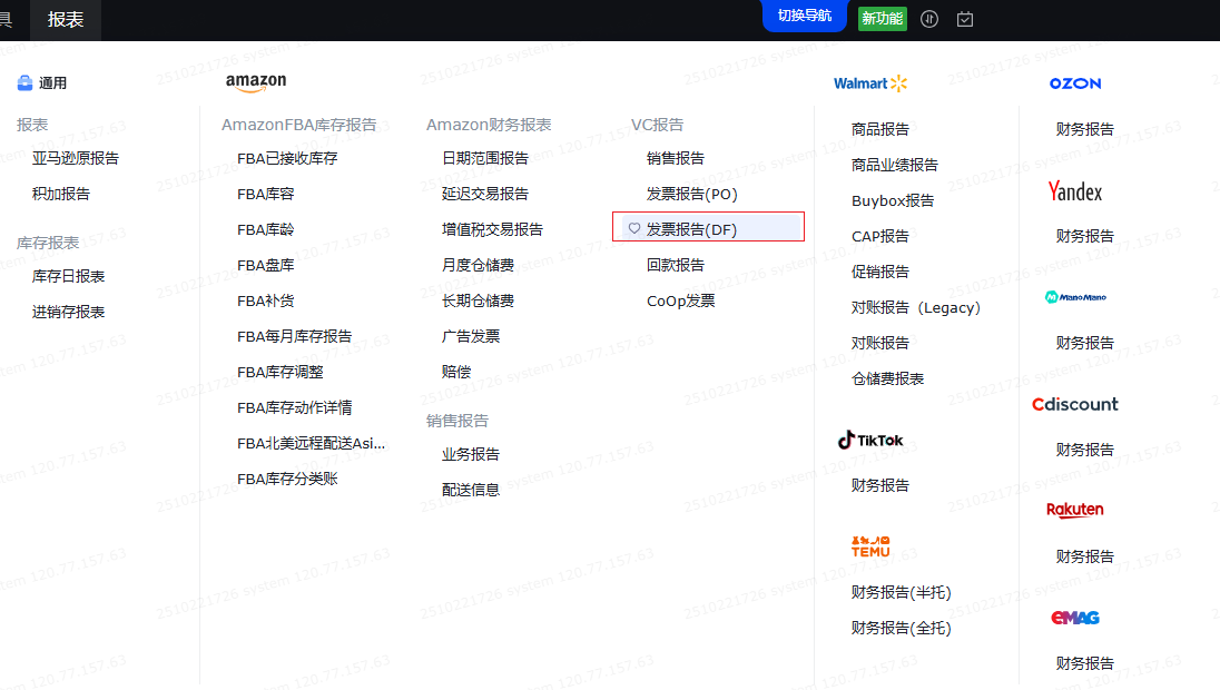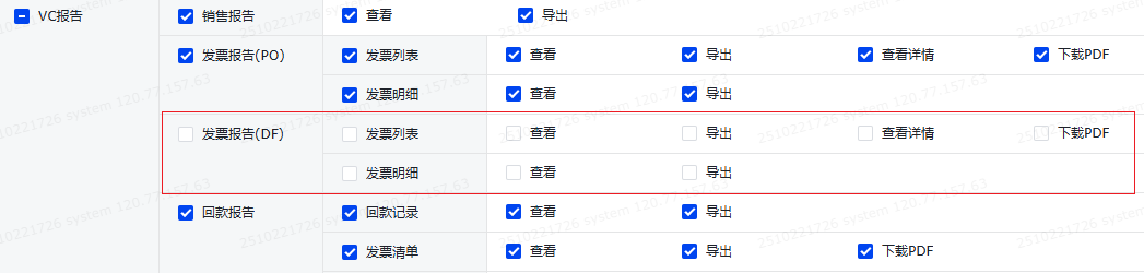注意:DF发票报告默认授权给了系统管理员,如需使用,请联系系统管理员开启菜单权限(路径:系统-菜单权限-功能权限-报表-VC-发票报告(DF))。