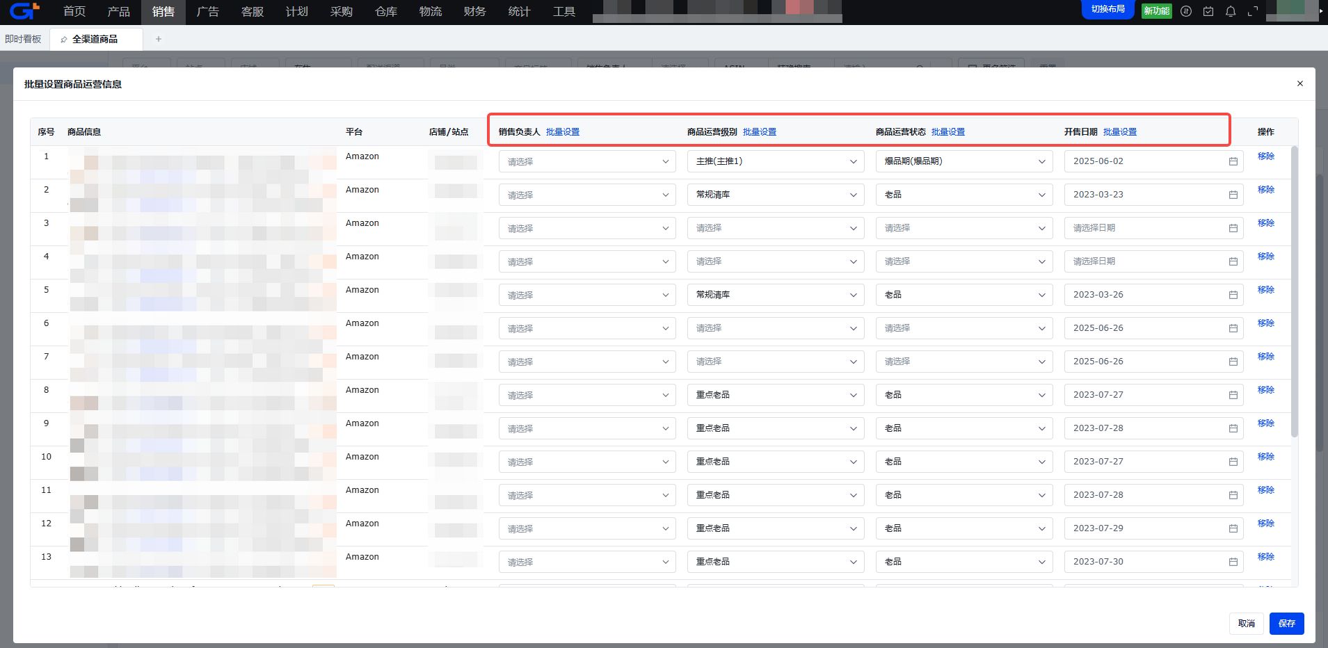 可对商品的销售负责人、运营级别、运营状态、开售时间进行设置