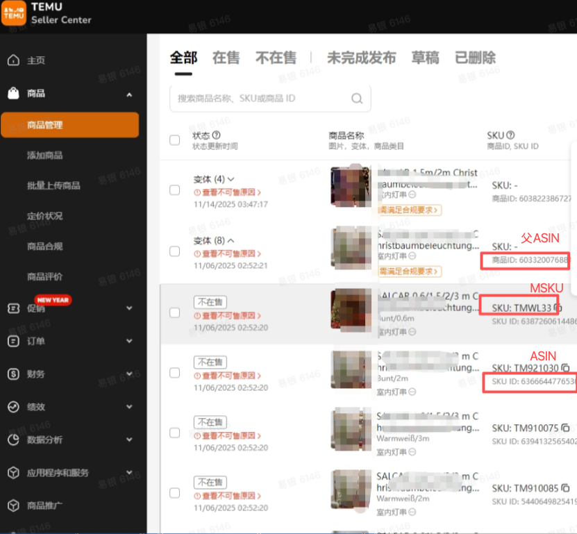3.ASIN:平台对商品的唯一标识。Shopify、Shoplazza、Etsy、ShopLine取自平台商品信息中的“变体ID”字段;Walmart、Manomano、Teapplix:取自平台商品信息中的“ItemID”字段