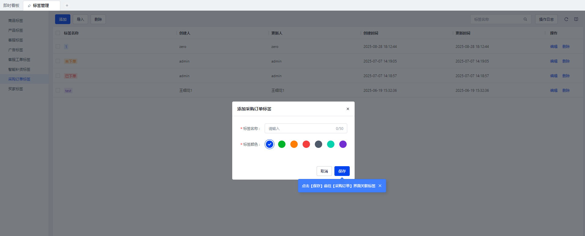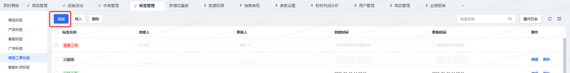支持为不同的对象(商品、产品、广告、客服)创建标签,并在商品管理、产品资料、客服及广告模块上打标签,便于使用与管理。