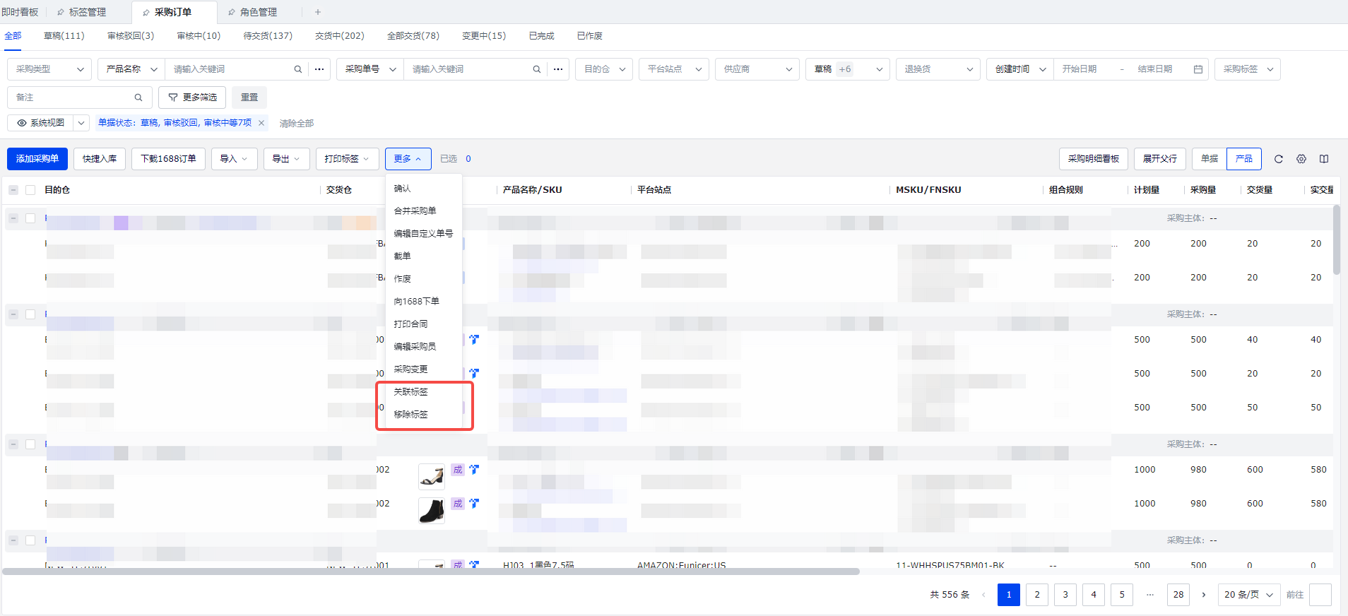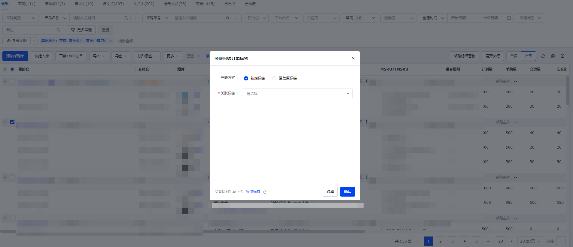 移除当前采购订单关联标签,下拉显示已关联数据,勾选确认解除关联。