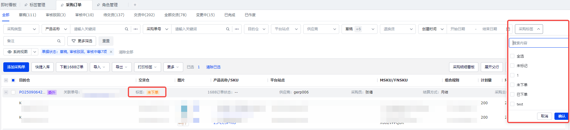 提醒:鼠标选中到单行采购订单,可单个关联标签