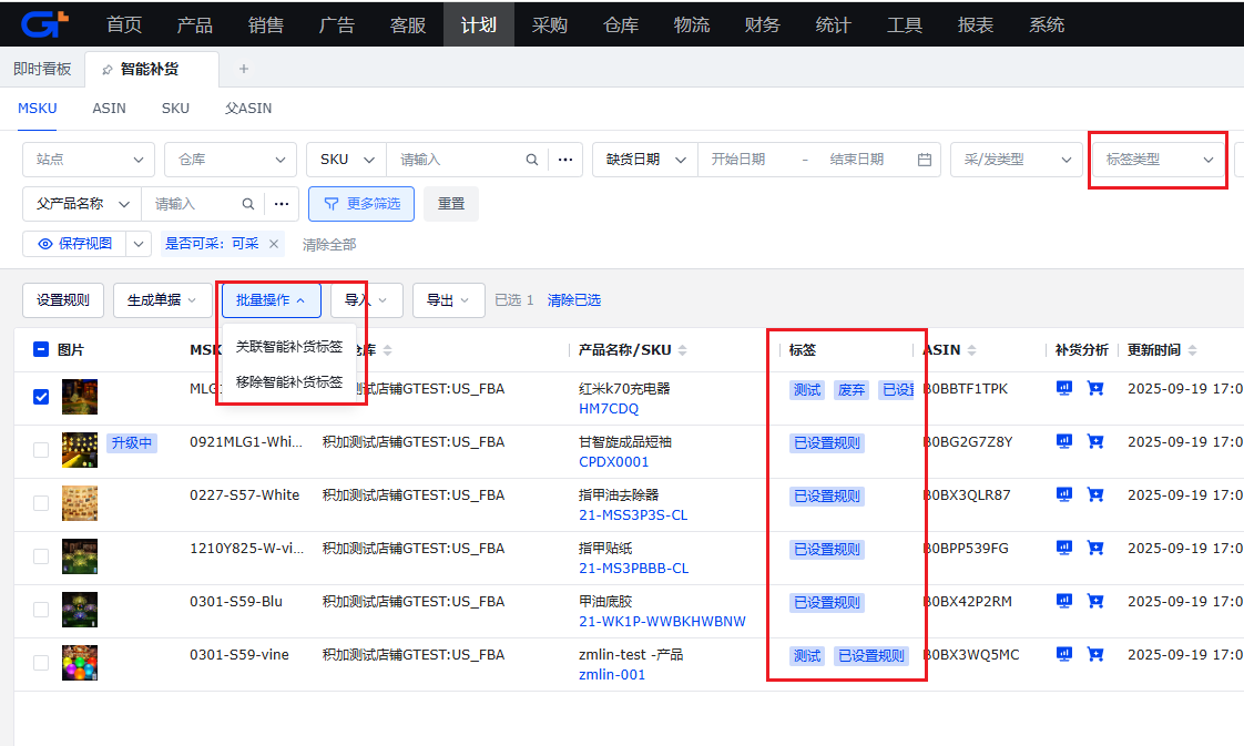 在【销售-Amazon-商品管理】模块关联/移除标签,勾选对应商品点击关联/移除标签,注意关联标签和移除的权限是单独管理的,默认系统管理员授权。