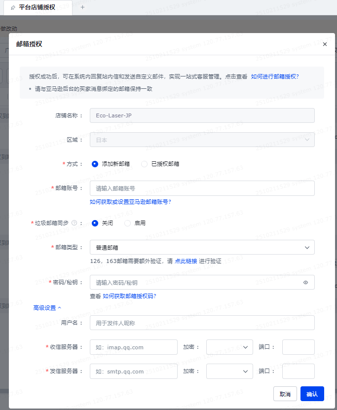点开高级设置,填写邮箱账号、密钥、收信服务器地址(填imap.gmail.com)、收信端口(填993)、发现服务器地址(填smap.gmail.com),发信端口(填465)、加密选择【SSL/TLS】