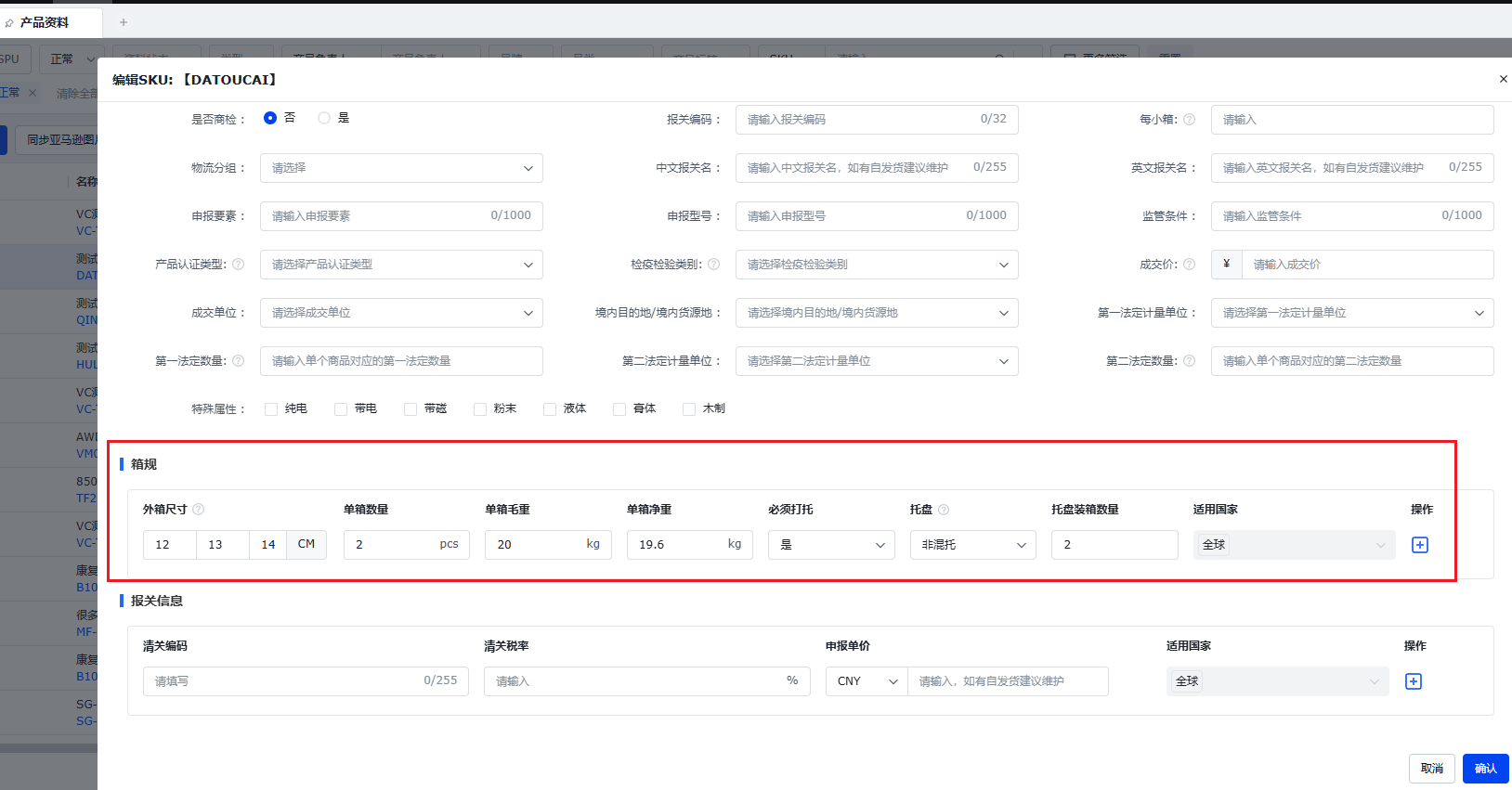 系统仅支持【独立部署】的店铺的PO订单加入自动化创建货件任务,加入自动化任务的产品需要关联SKU、选择发货仓、维护发SKU产品资料中的【物流/报关-箱规-外箱尺寸/单箱数量/单箱净重
