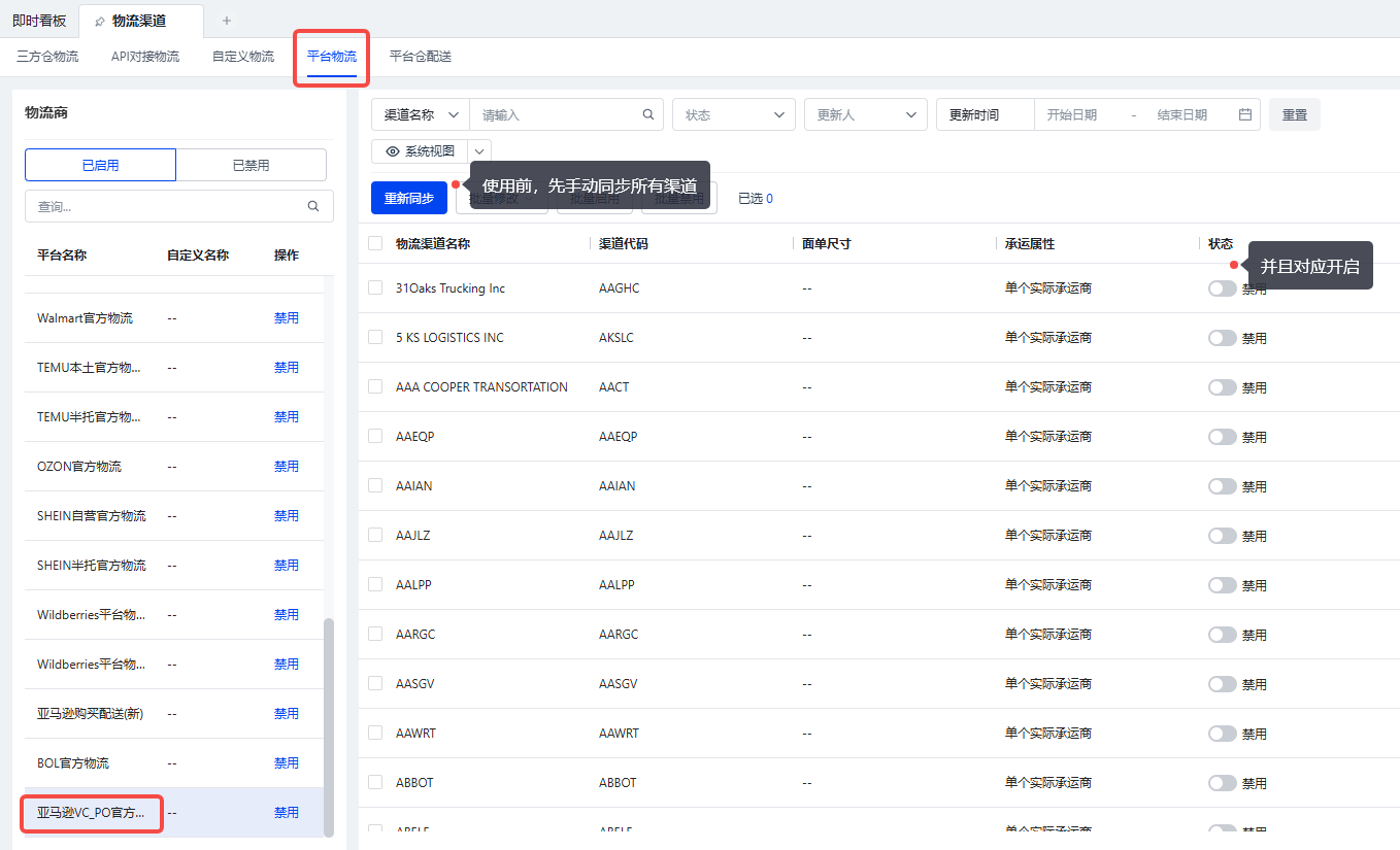 需要提前配置的原因:系统预设了“平台物流-亚马逊VC PO官方物流”,维护好之后,当系统获取到亚马逊承运人就会以这个映射关系推送给仓库