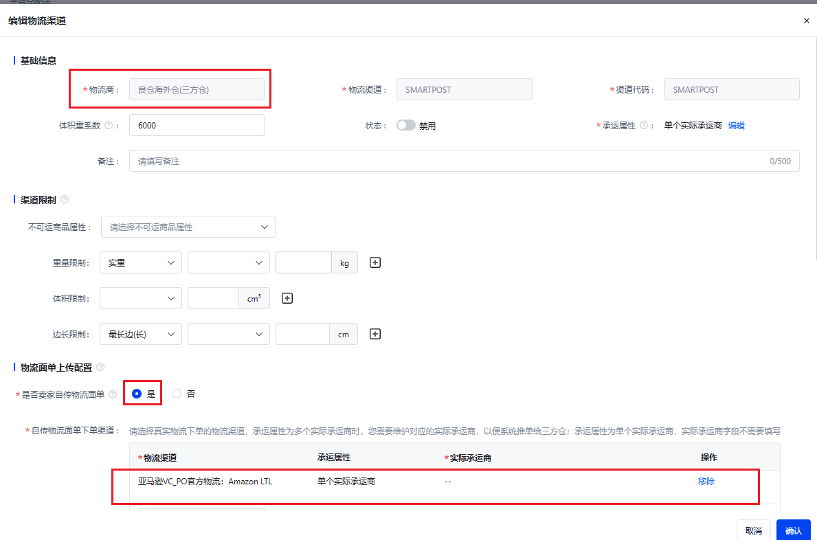 (注意:图片中的物流商和物流渠道均为举例数据,请按照您实际发货三方仓对应渠道绑定)