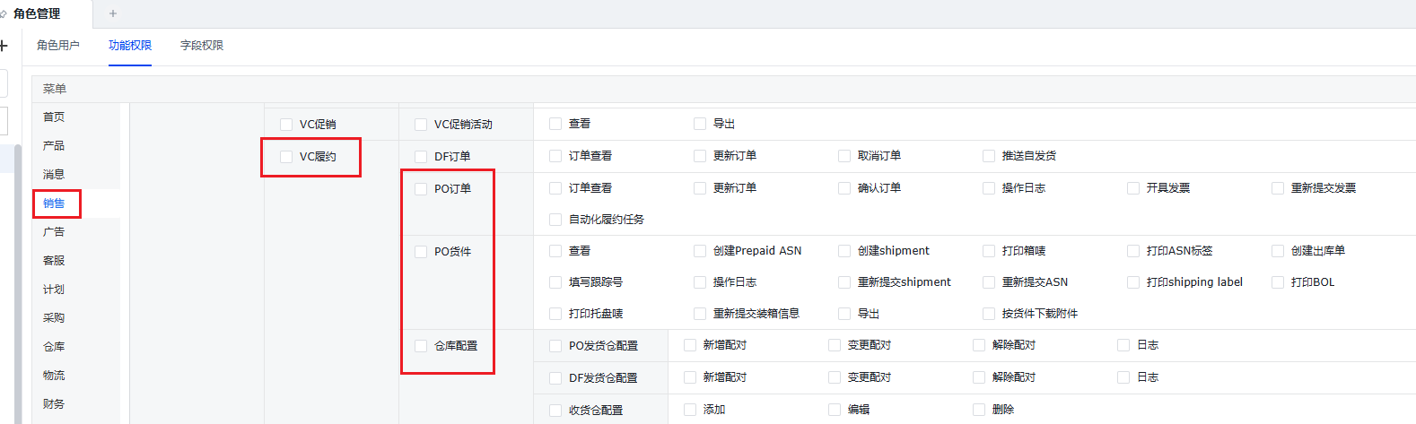 入口:系统-权限管理-角色管理(销售-亚马逊VC-VC PO订单 + VC PO货件 + 仓库配置)