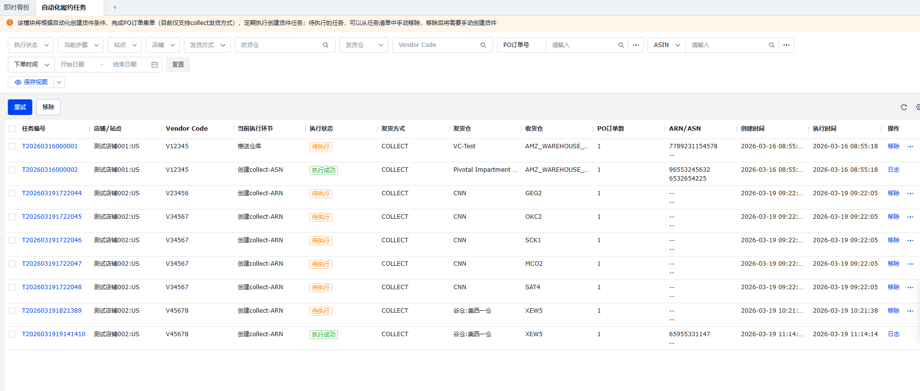 该模块将根据自动化创建货件条件,完成PO订单集单(目前仅支持collect发货方式),定期执行创建货件任务;待执行的任任务,可以从任务清单中手动移除,移除后将需要手动创建货件