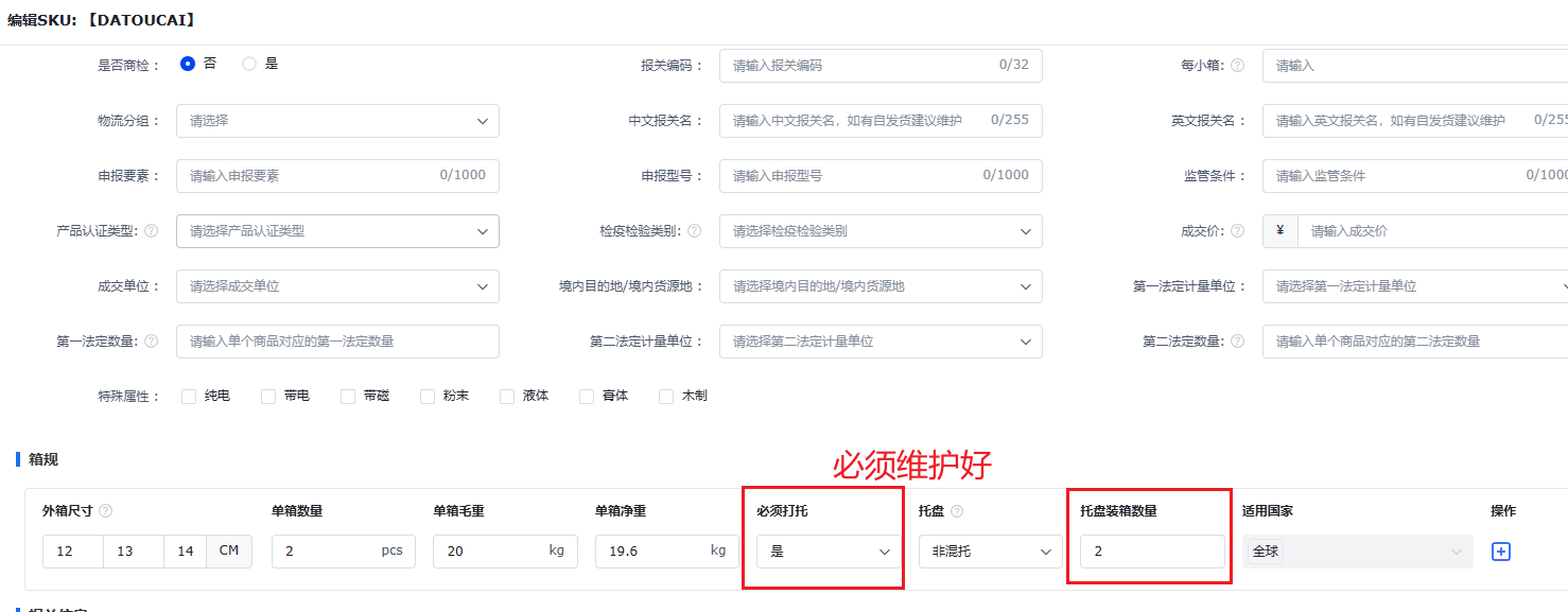 注:如果产品为必须打托,则一定要维护好托盘装箱数量,否则系统会根据亚马逊政策要求计算每托装箱数量,不一定符合仓库线下要求
