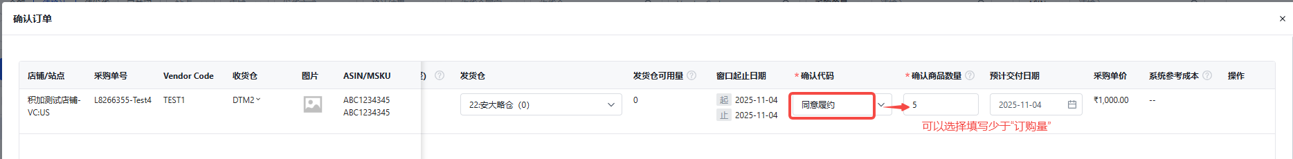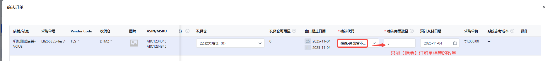 注:如果一个产品需要分多个仓库发货,可以在操作列点击“添加发货仓”;如果一个产品需要拒单,请将确认数量=订购数据,不允许部分拒绝,只允许部分接收