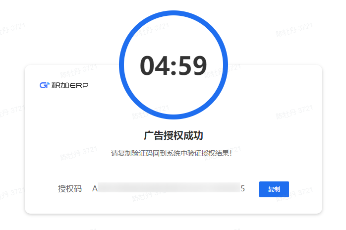 如果选择【所有当前和未来账户】选项,然后点击【继续】按钮,则会直接出现授权码弹窗,复制授权码回填到积加ERP系统即可